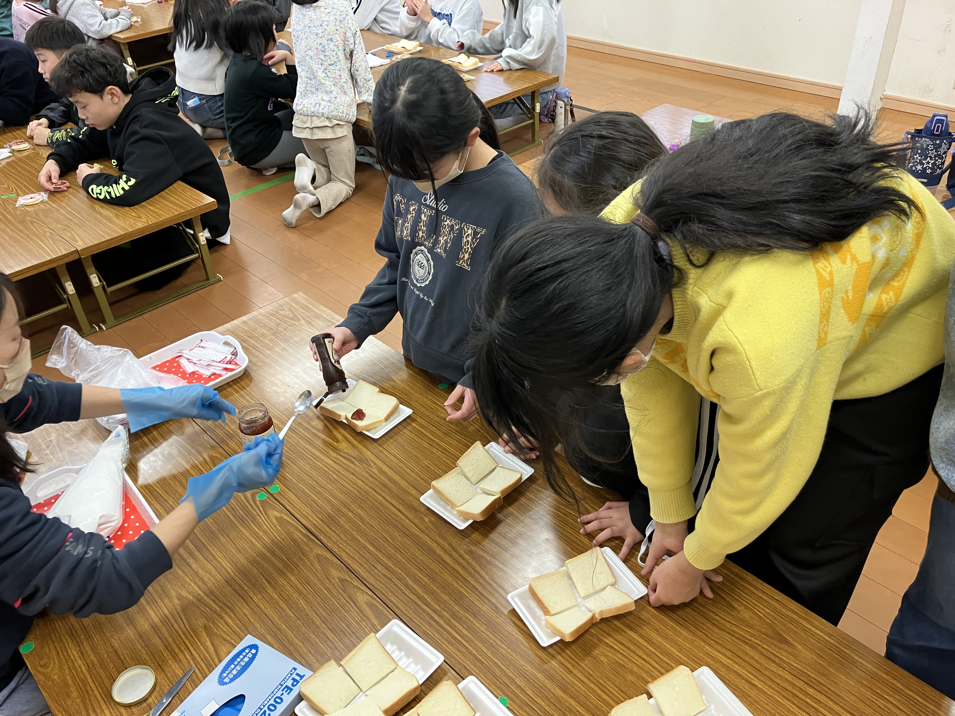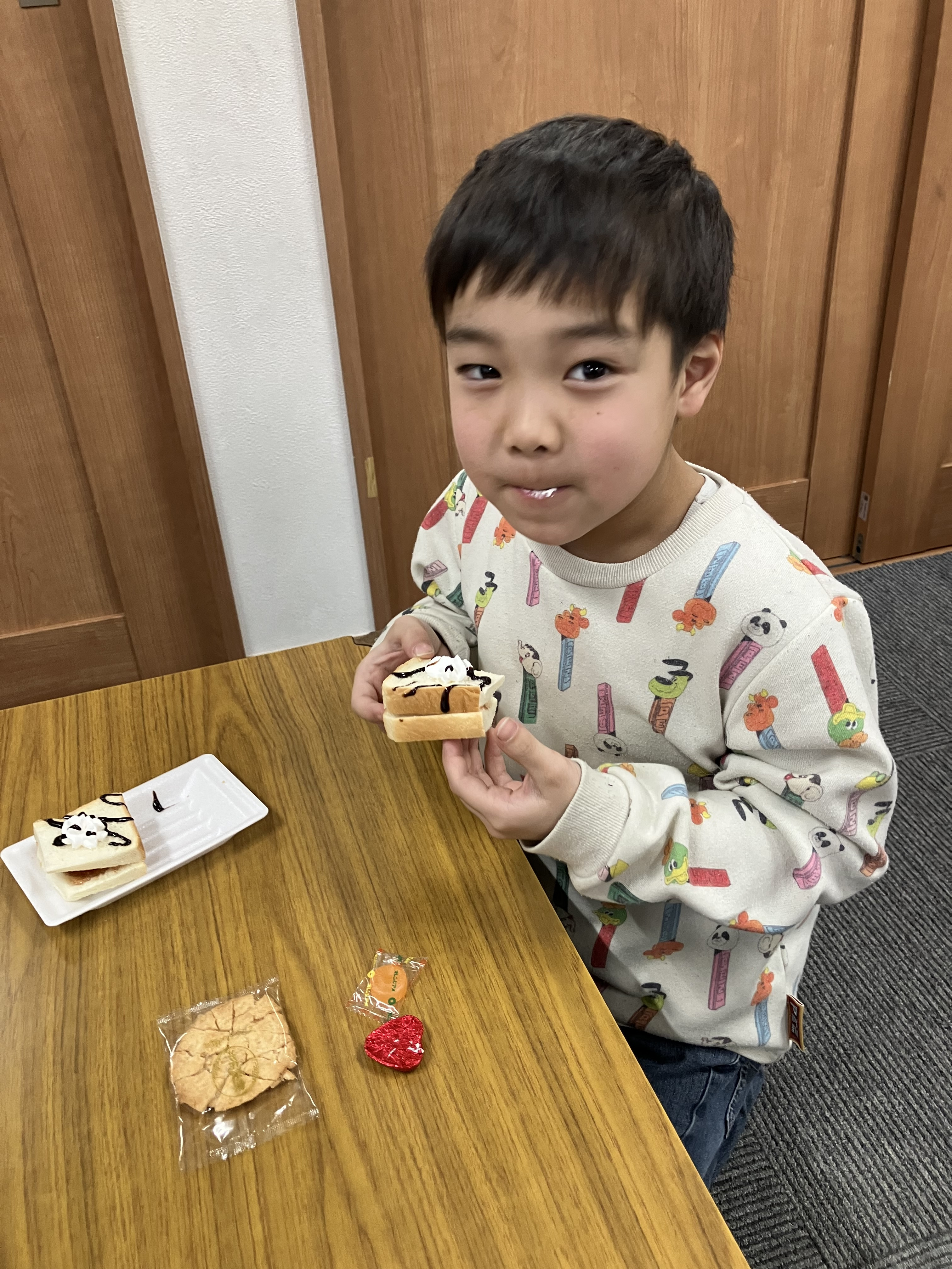 食パンに生クリームやチョコソース、ジャムをのせて・・・いただきま~す!!