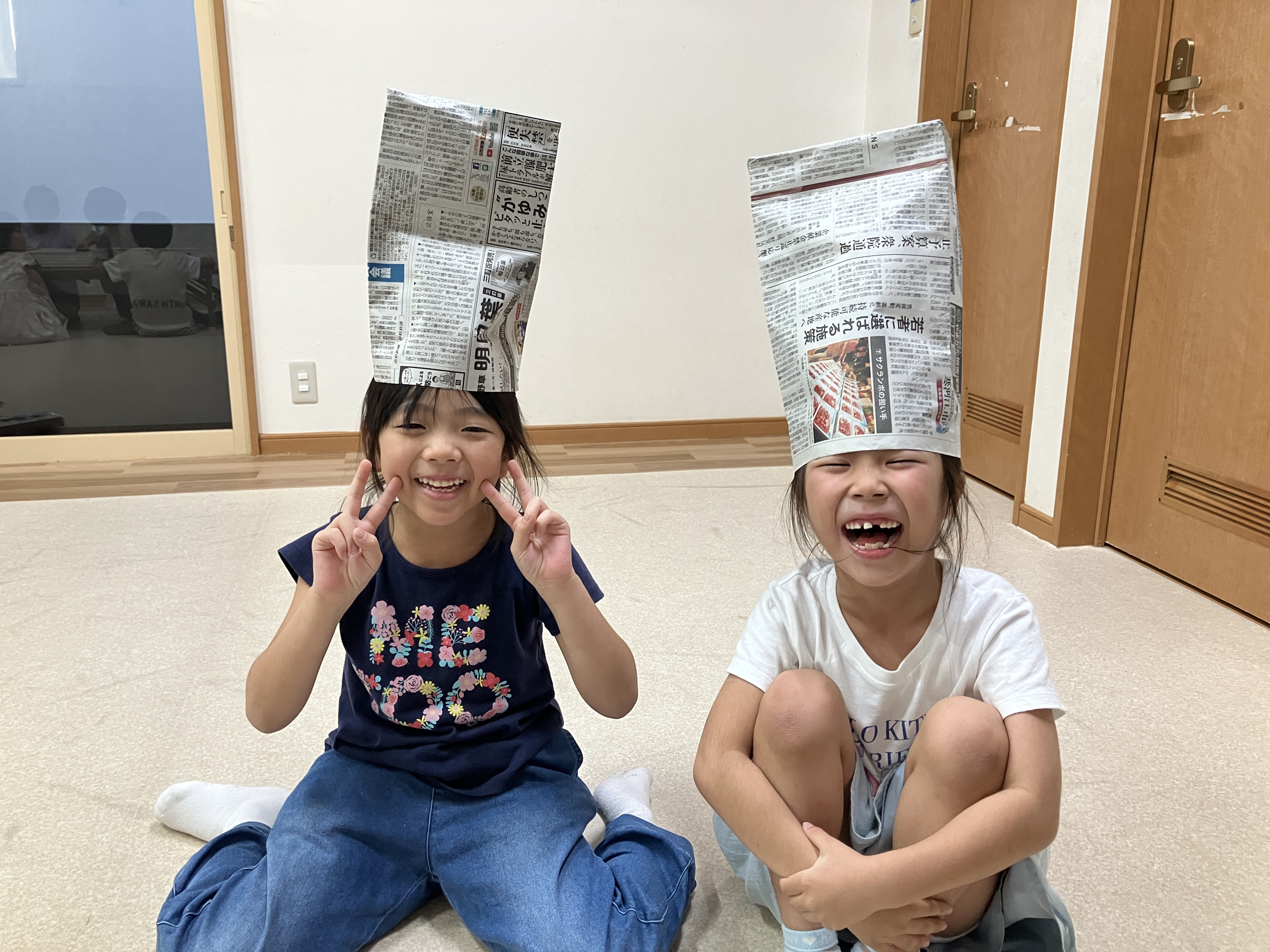 新聞紙でつくったコックさん帽子がお似合いな二人です👩🍳👨🍳
