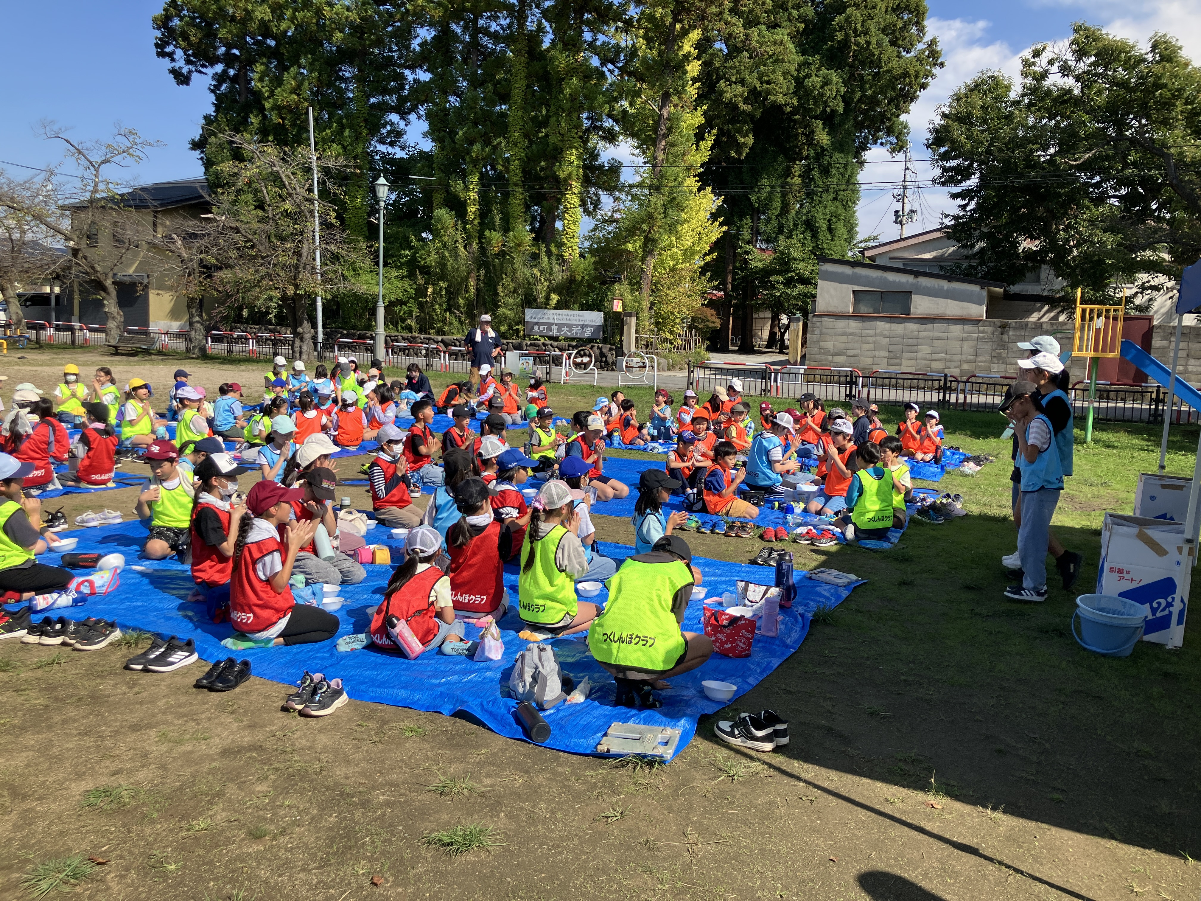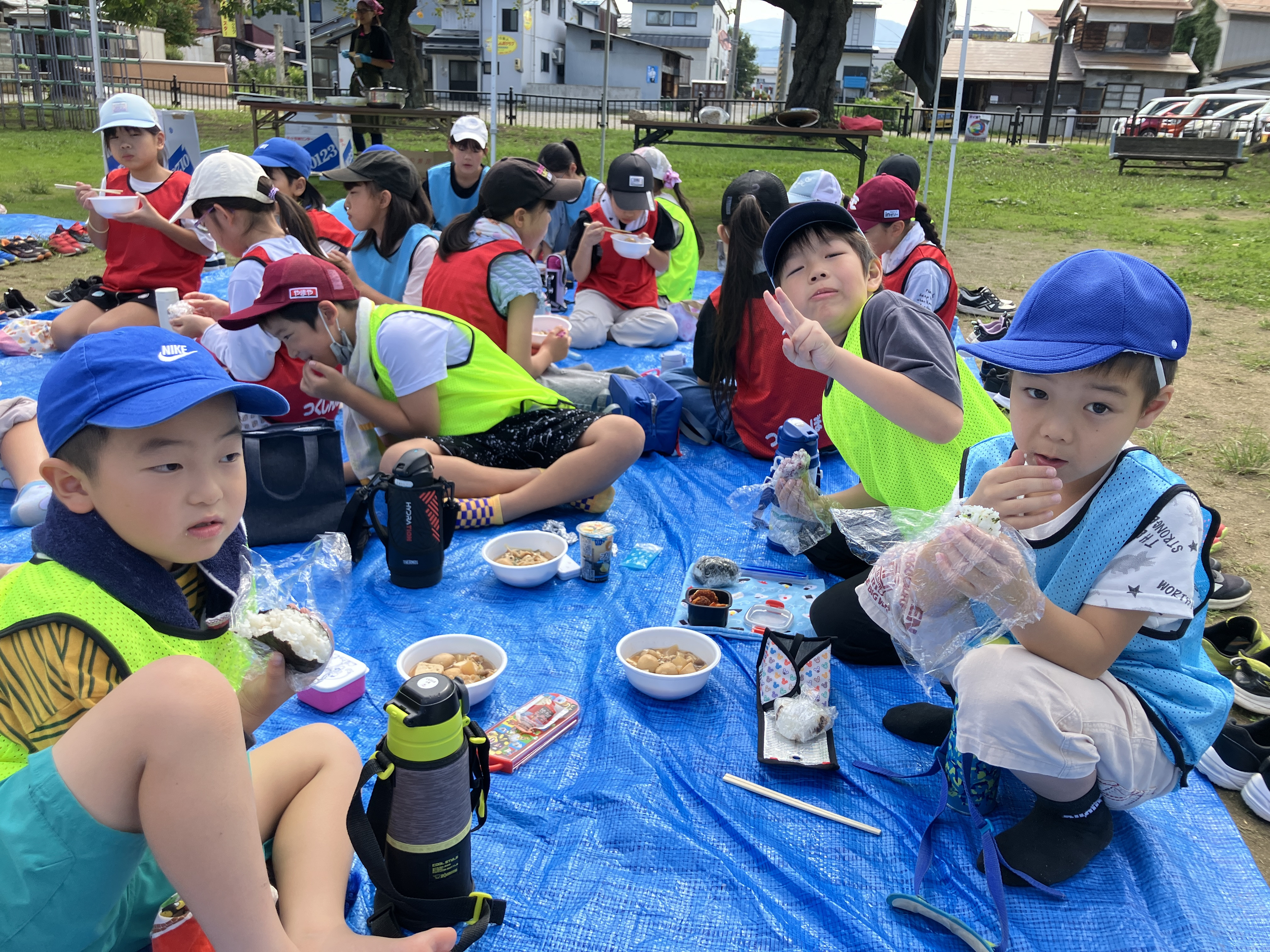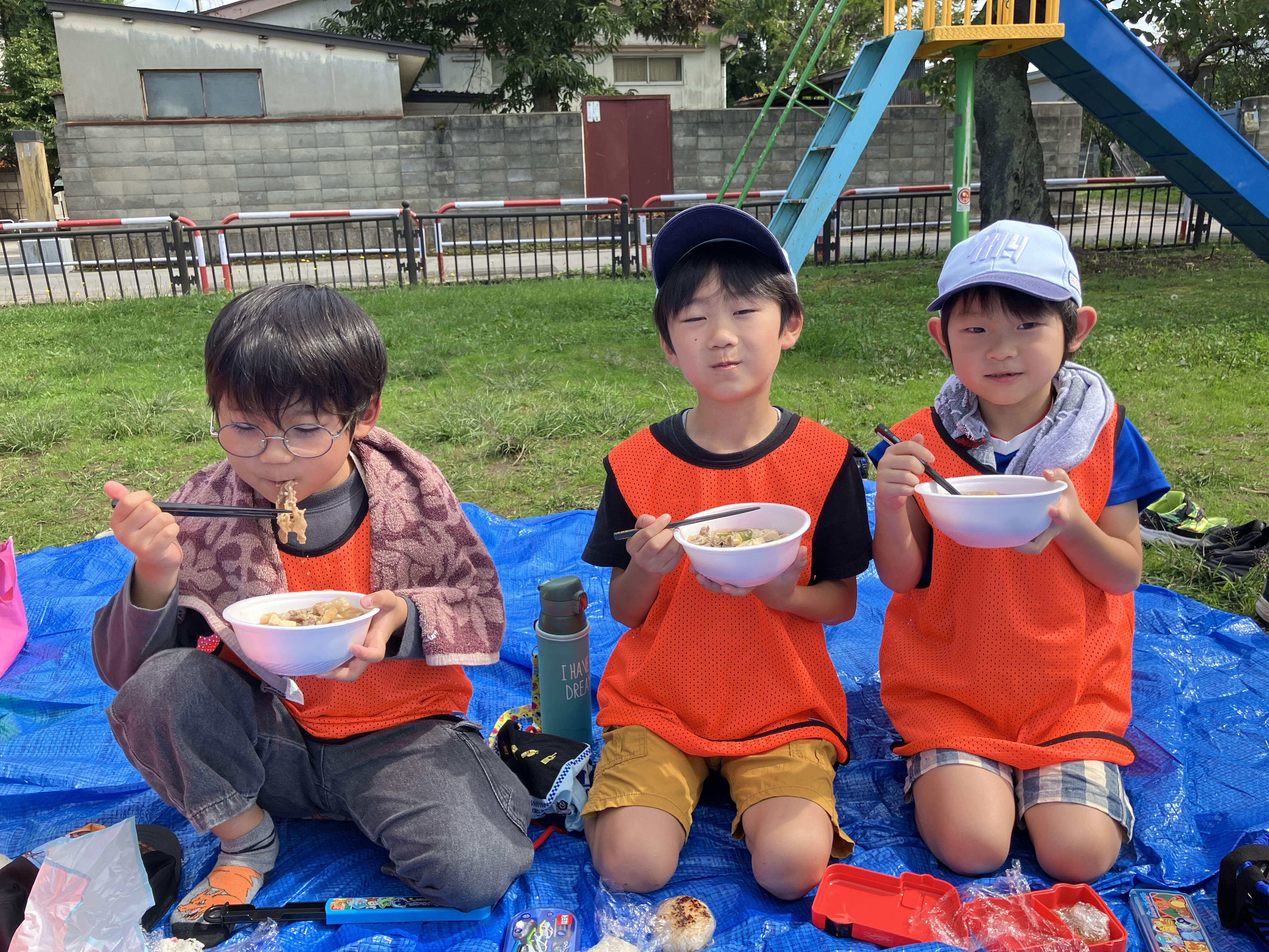 お昼は4施設集まり、秀公園にブルーシートを敷き、芋煮会を行いました😄