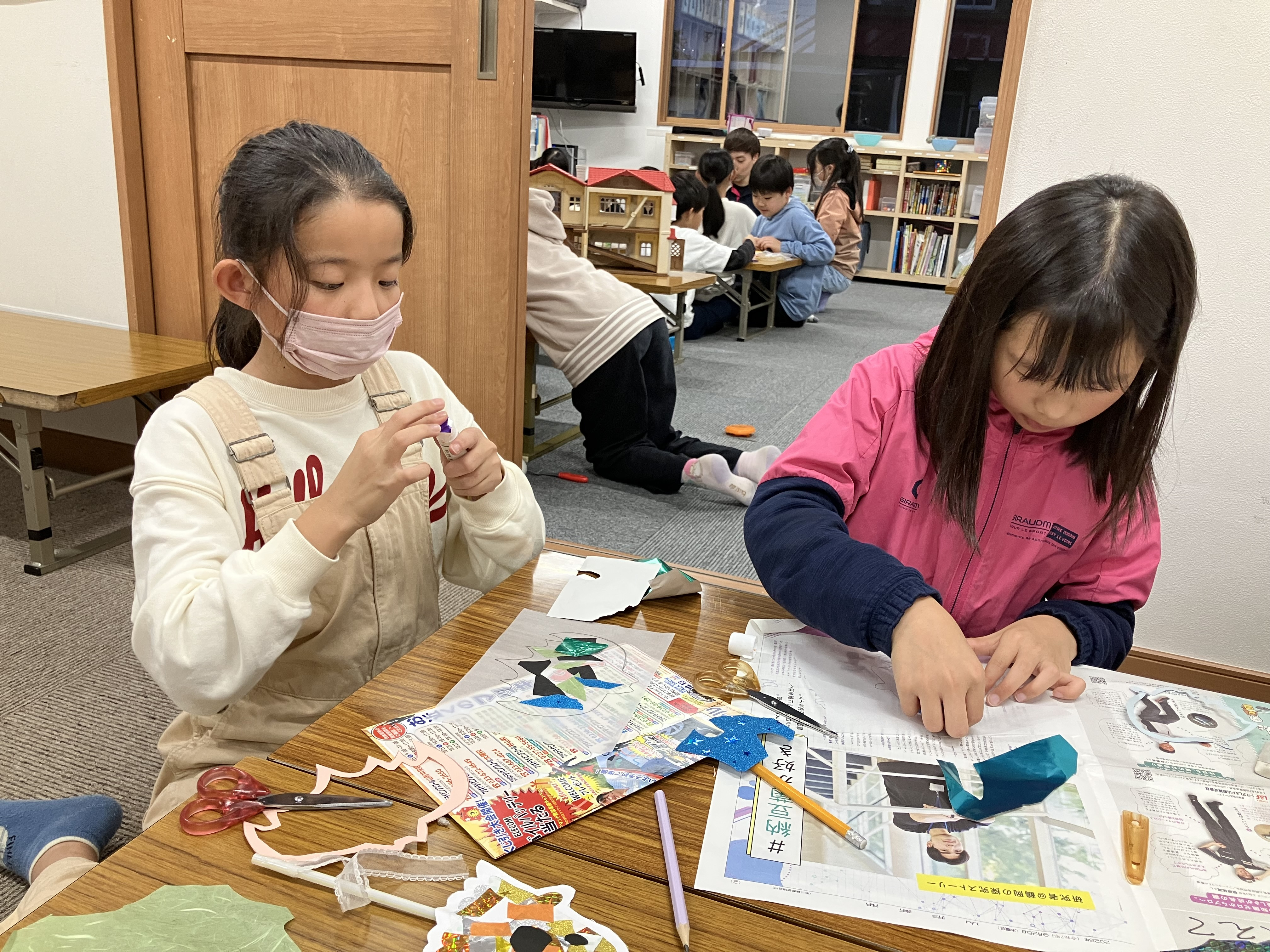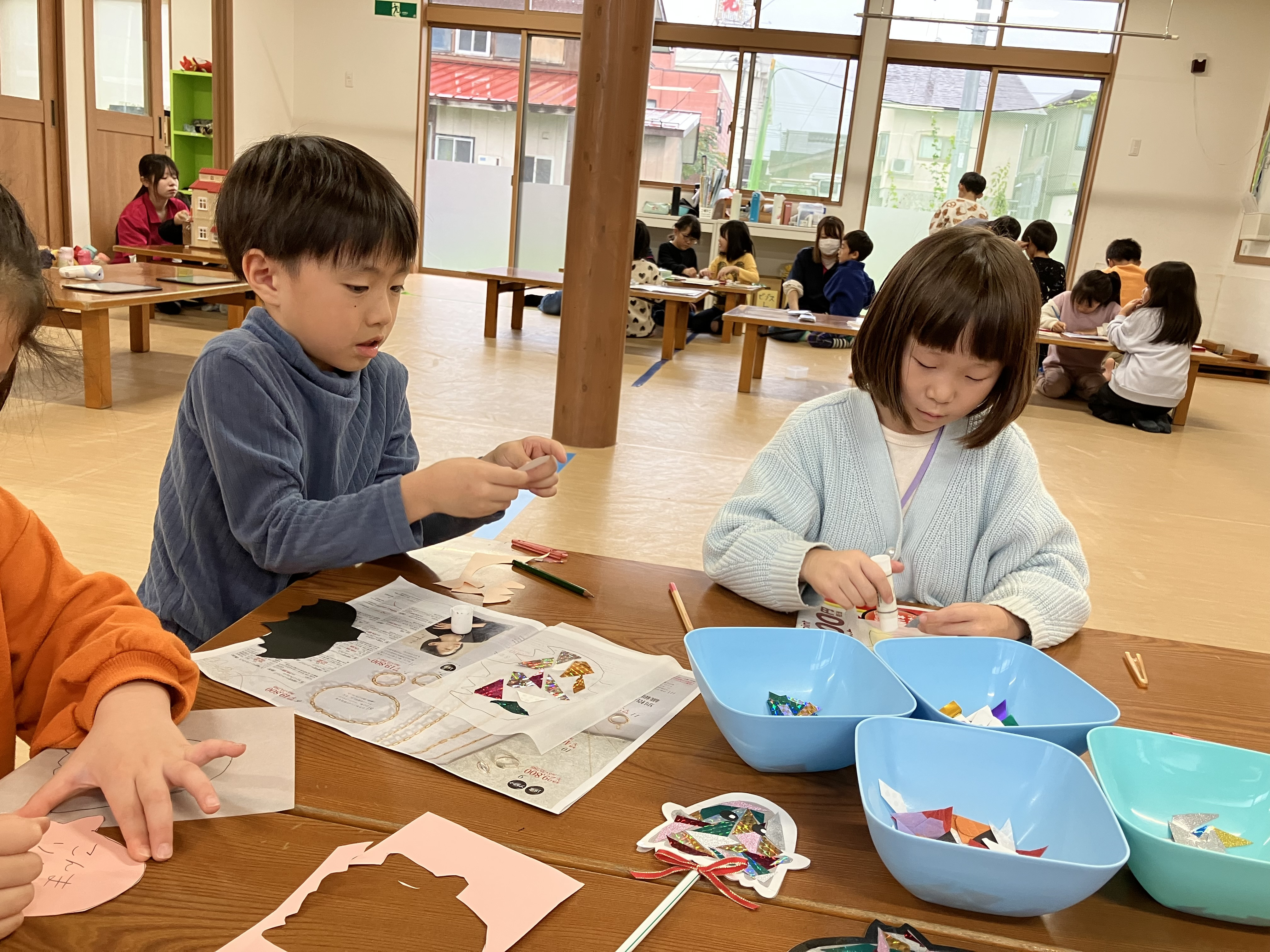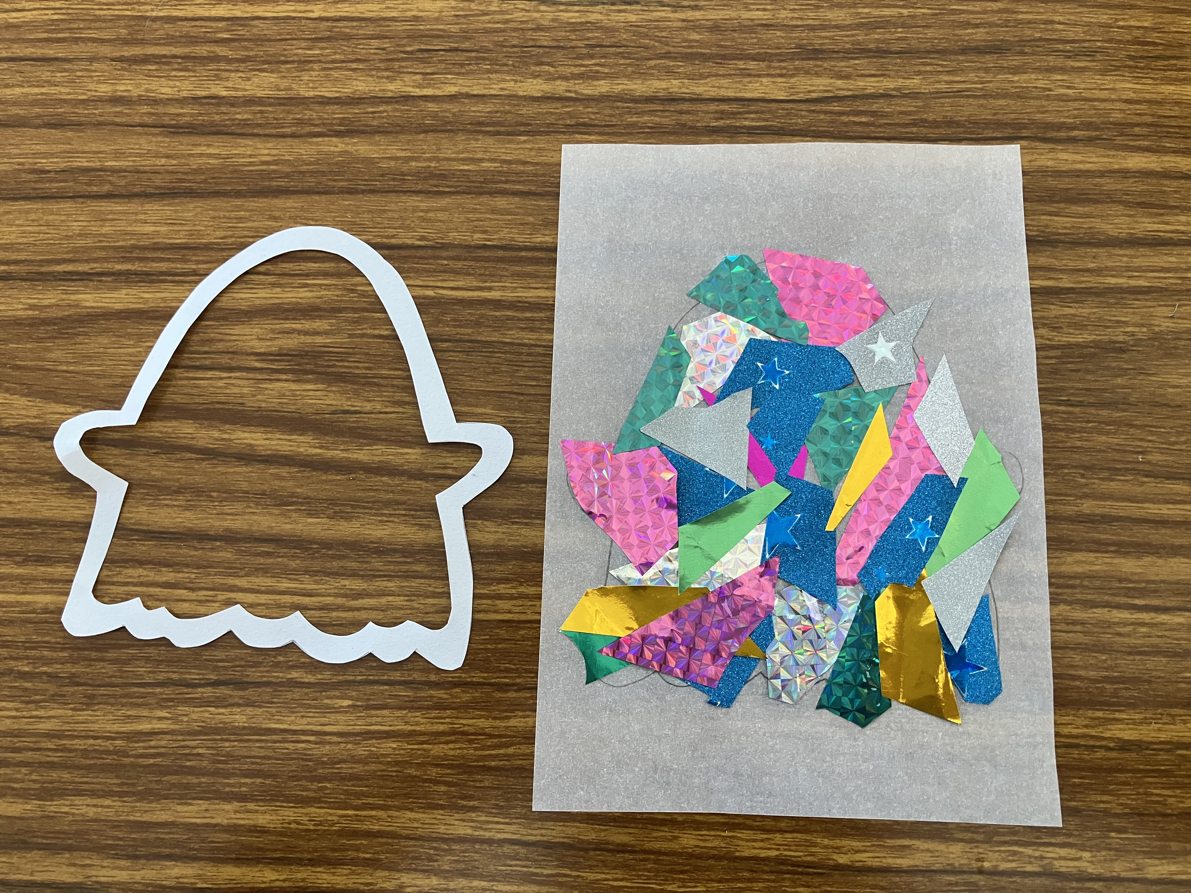 ③写し絵の紙に、好きなように切ったキラキラ折り紙を貼っていきます。