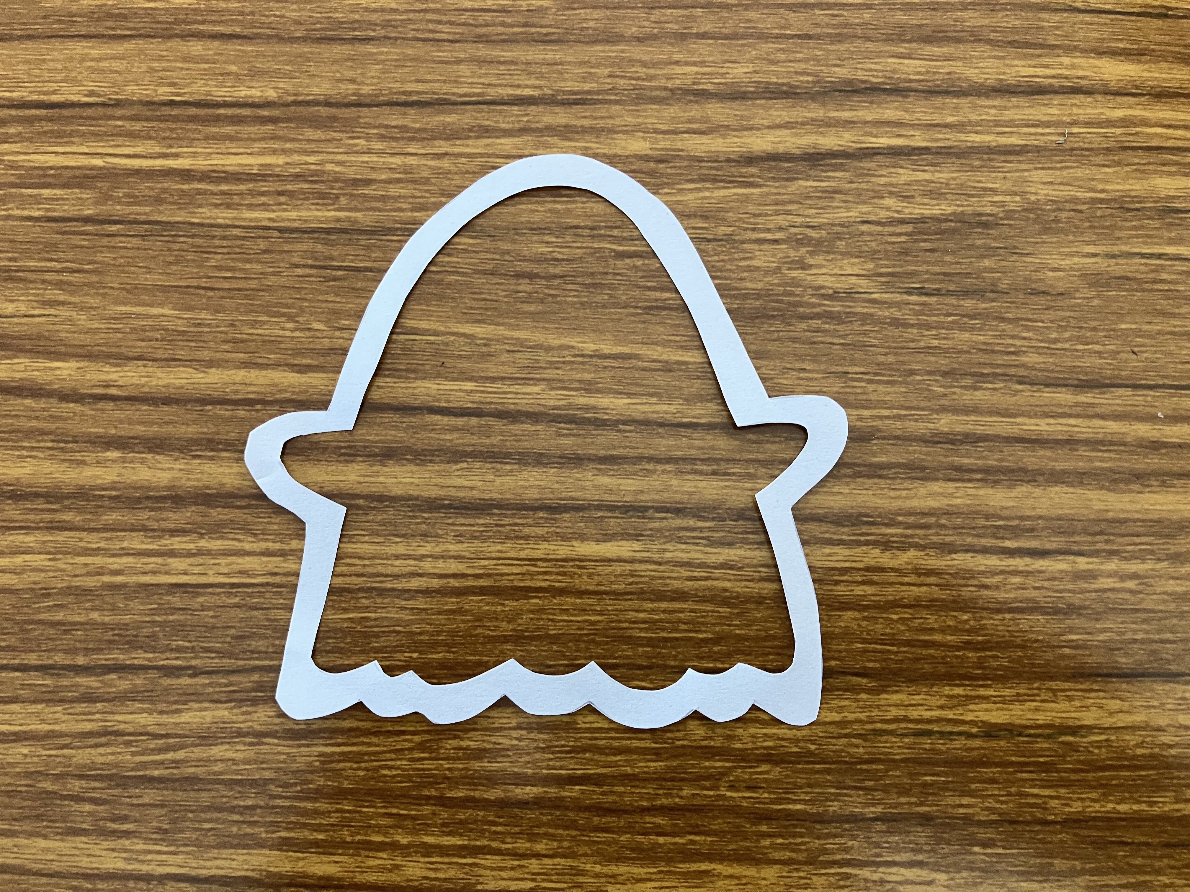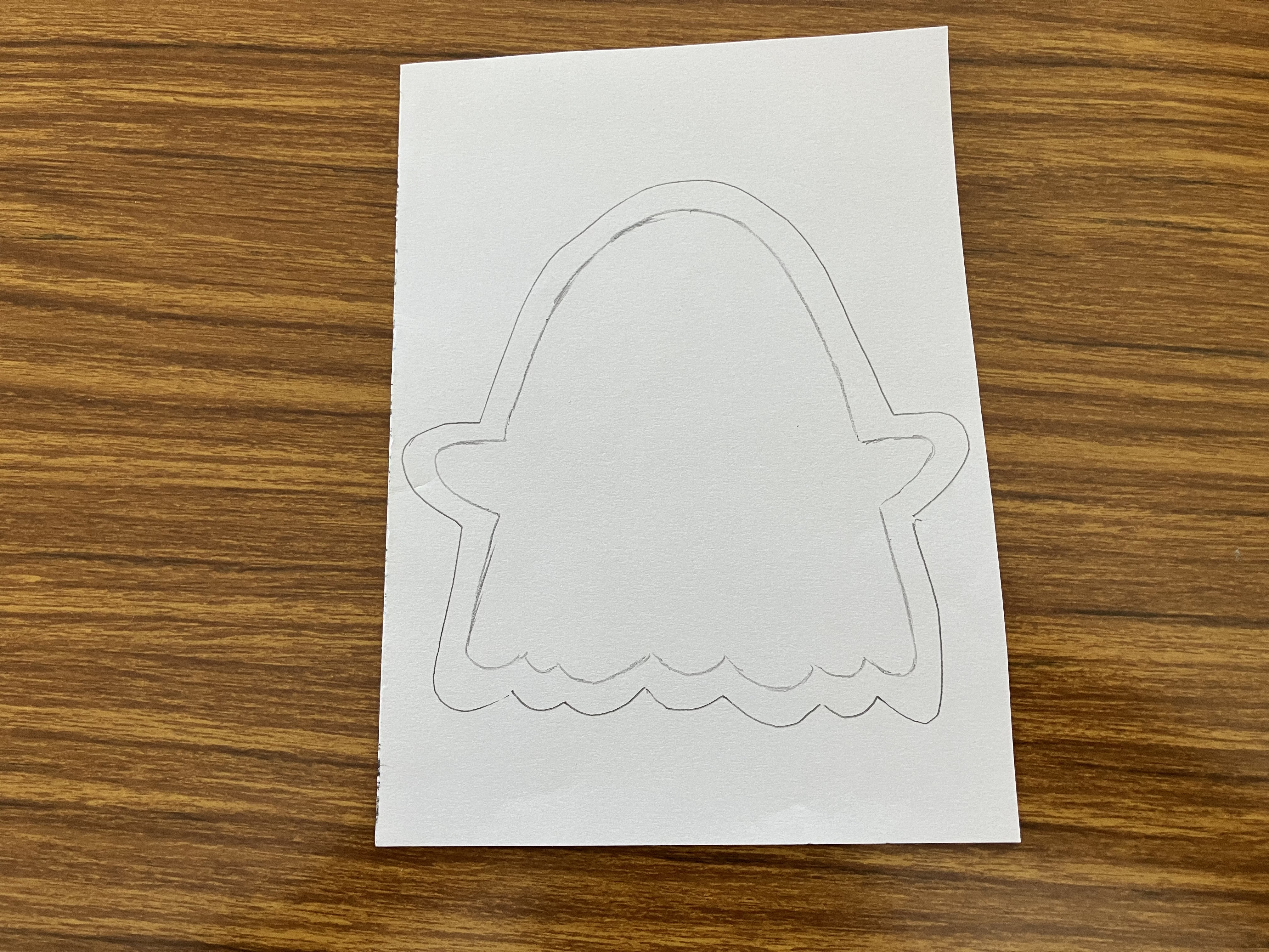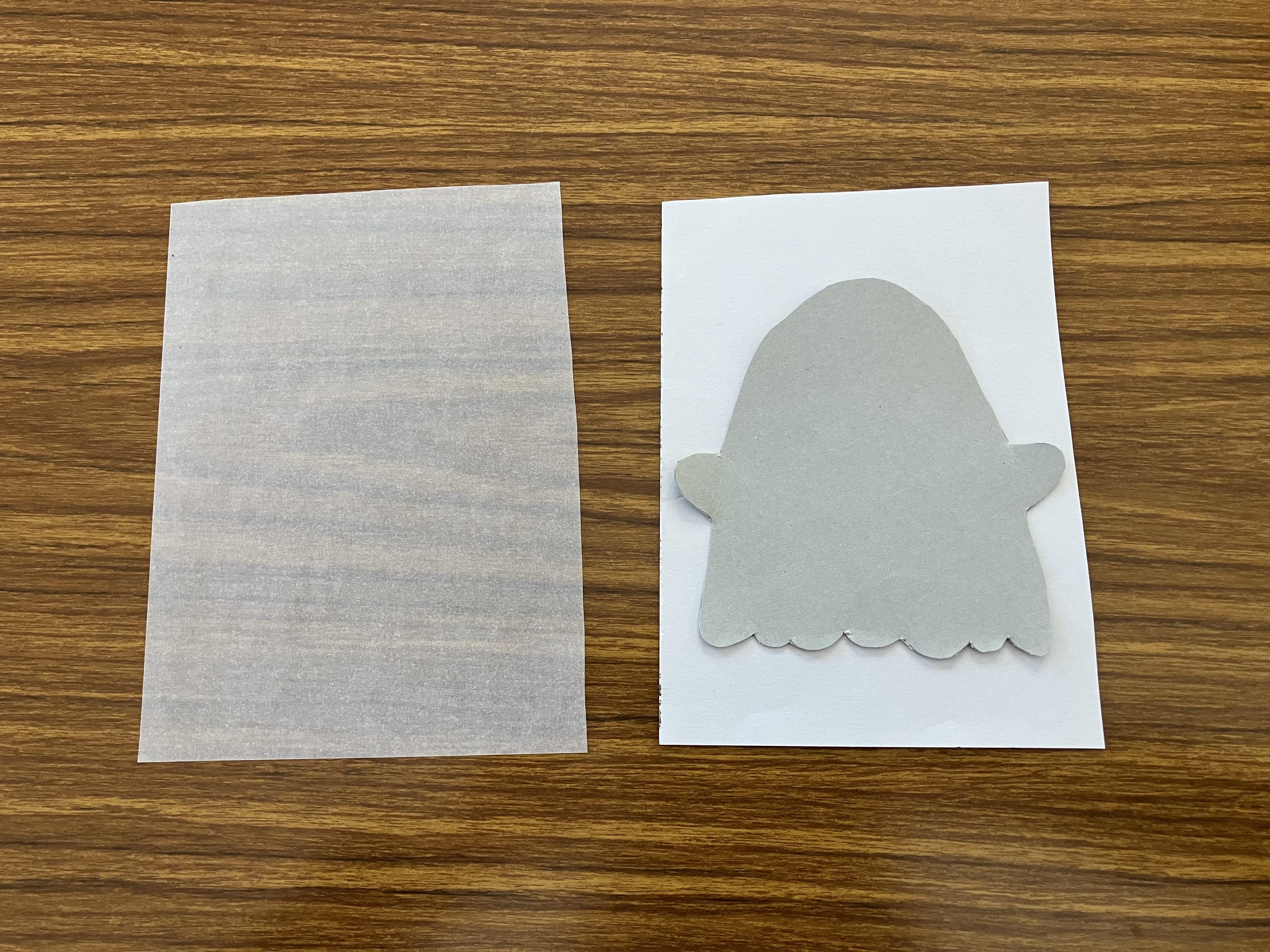 ①色画用紙と写し絵の紙に作りたい柄を同じように描きます。※今回は厚紙でおばけの型紙を作り、なぞって描きました~