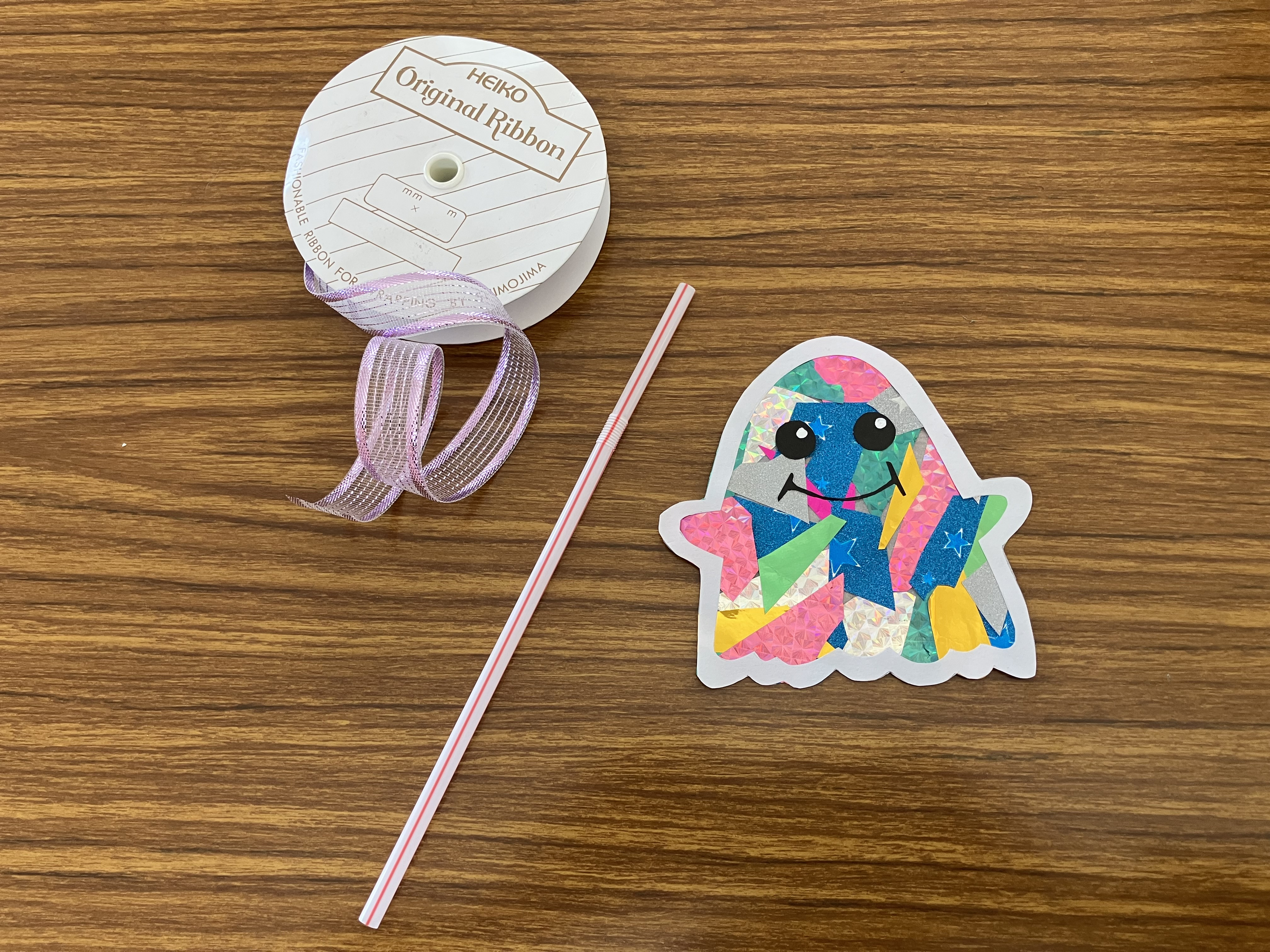 ④裏にストローをテープで貼り、リボンを巻いたら出来上がりです。