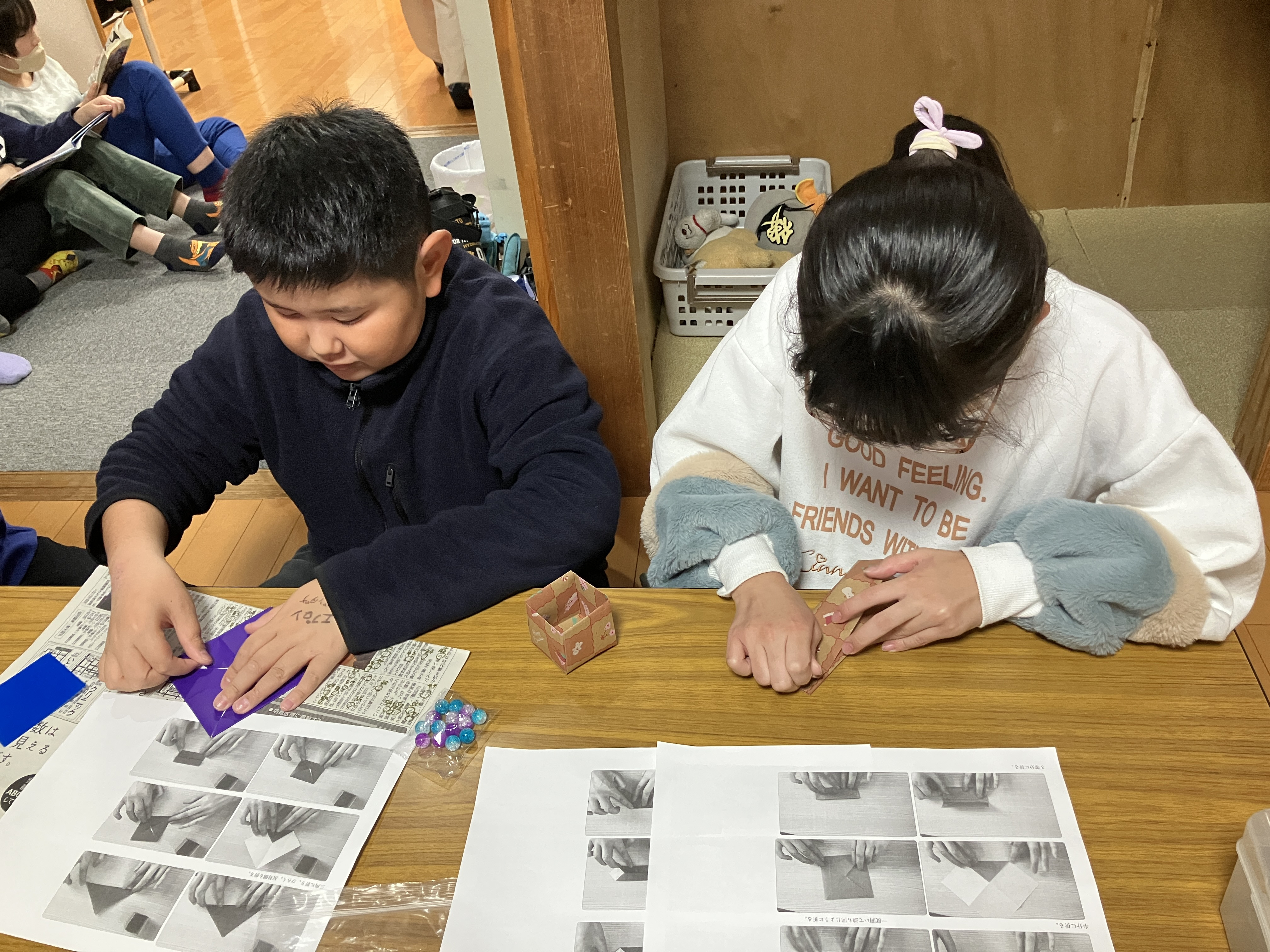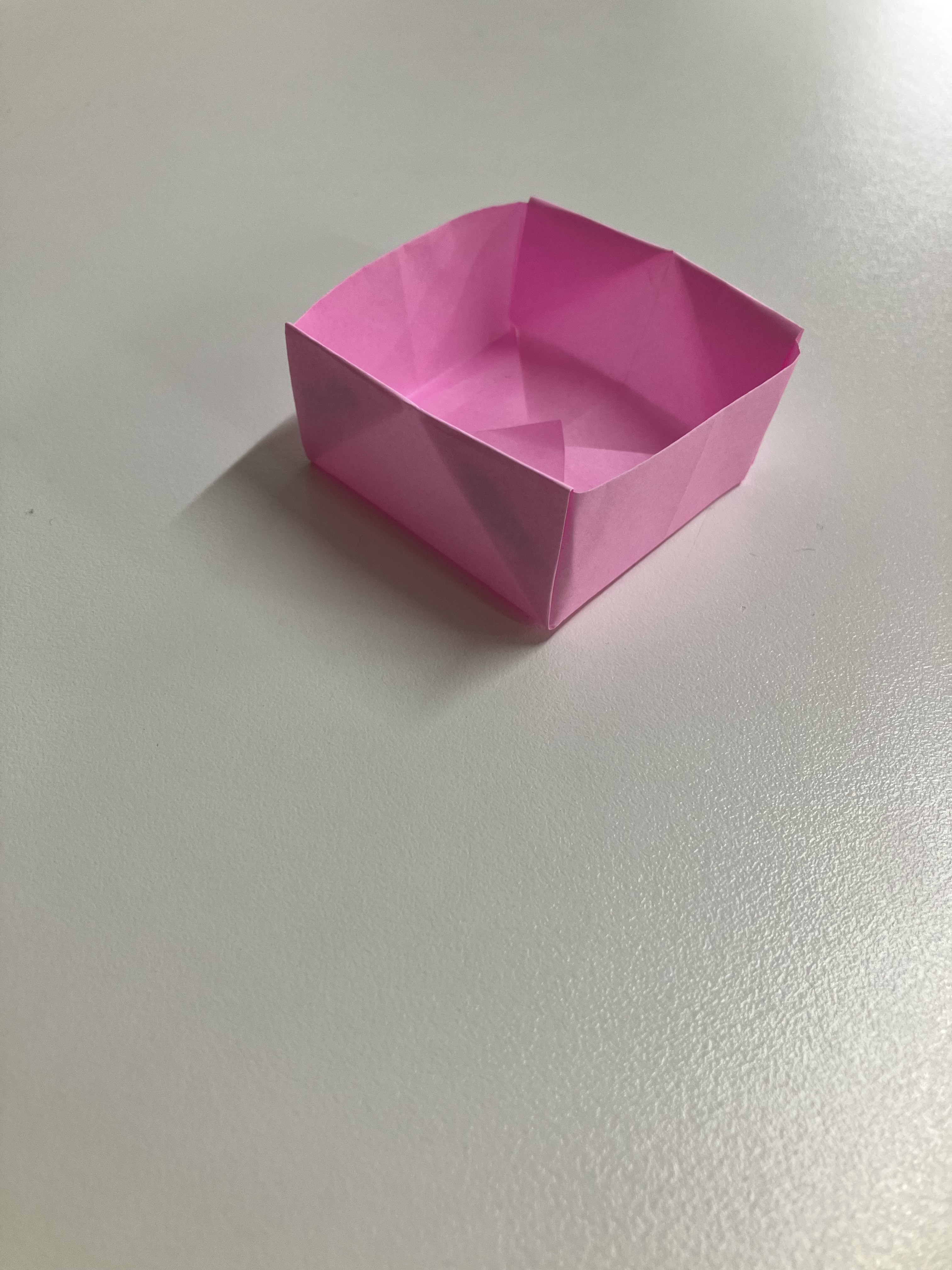 ⑥図のように折り目ができました。あとは箱と同じように、立てて、折り目に沿って折ればふたの完成です。