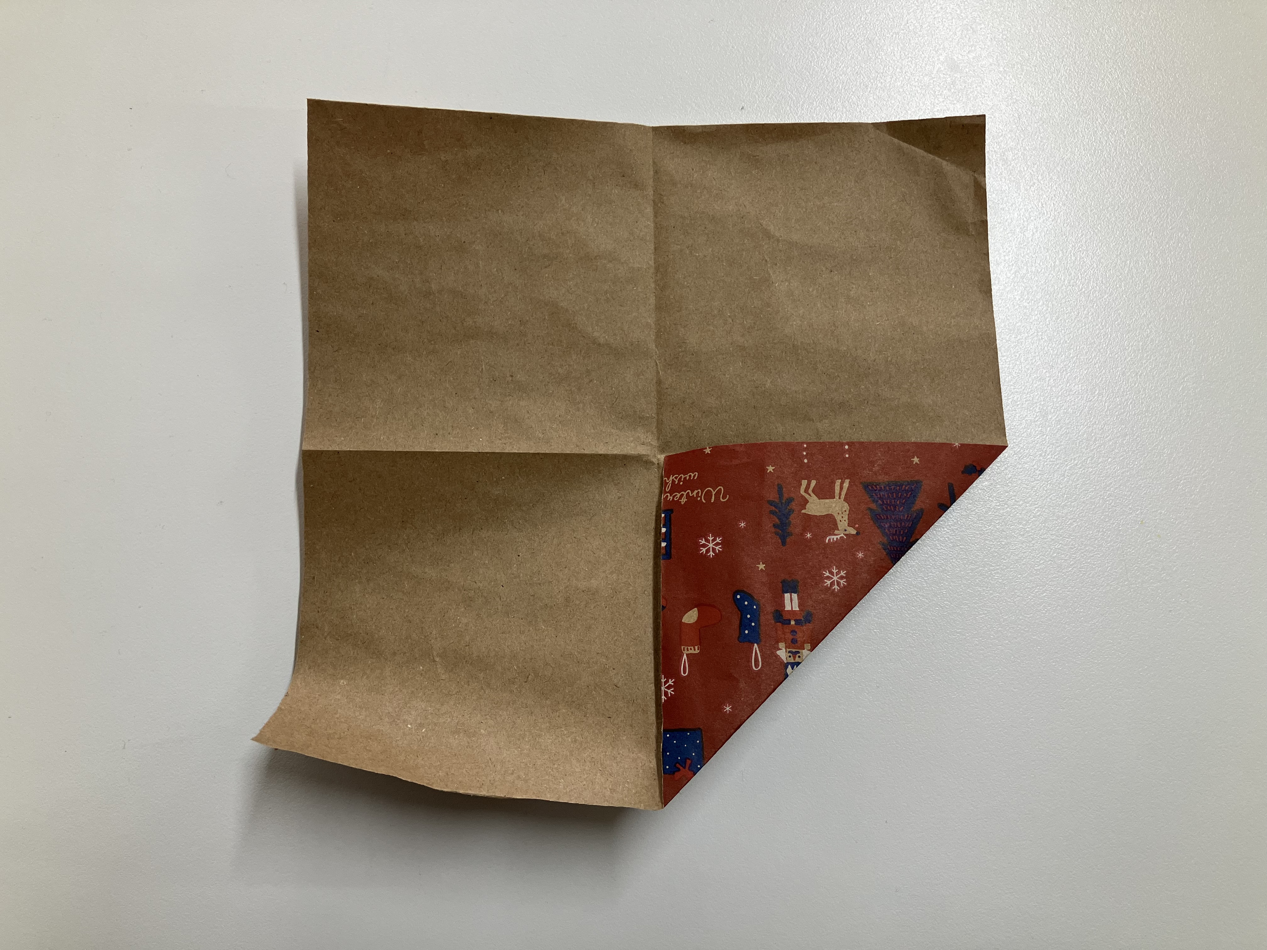 ①包装紙を半分にたたみ、開いて逆側に半分に折り、折り目をつけます。