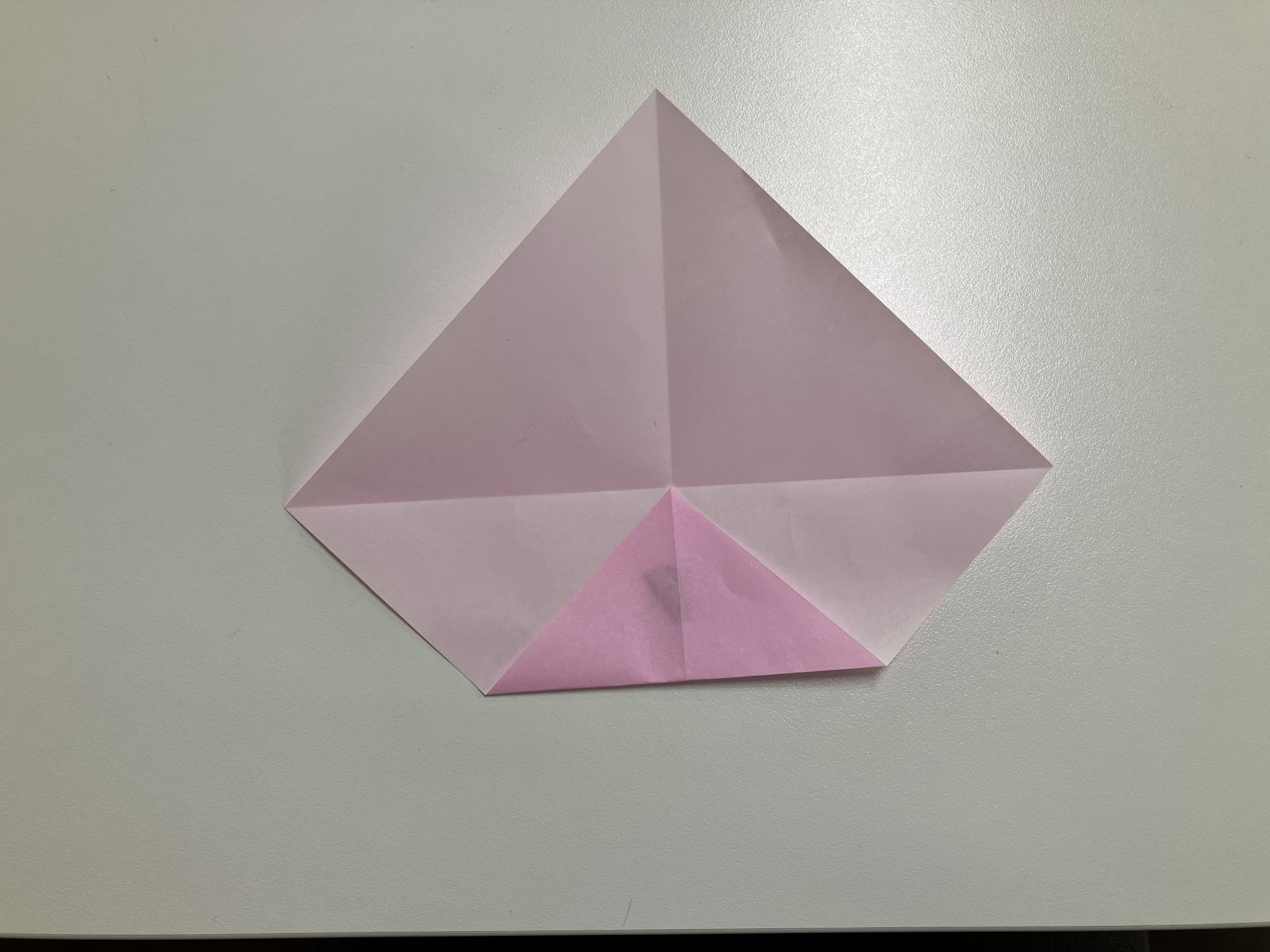 ⑤図の右下の角が上の線にいくまで折上げます。4つ角すべて折ります。