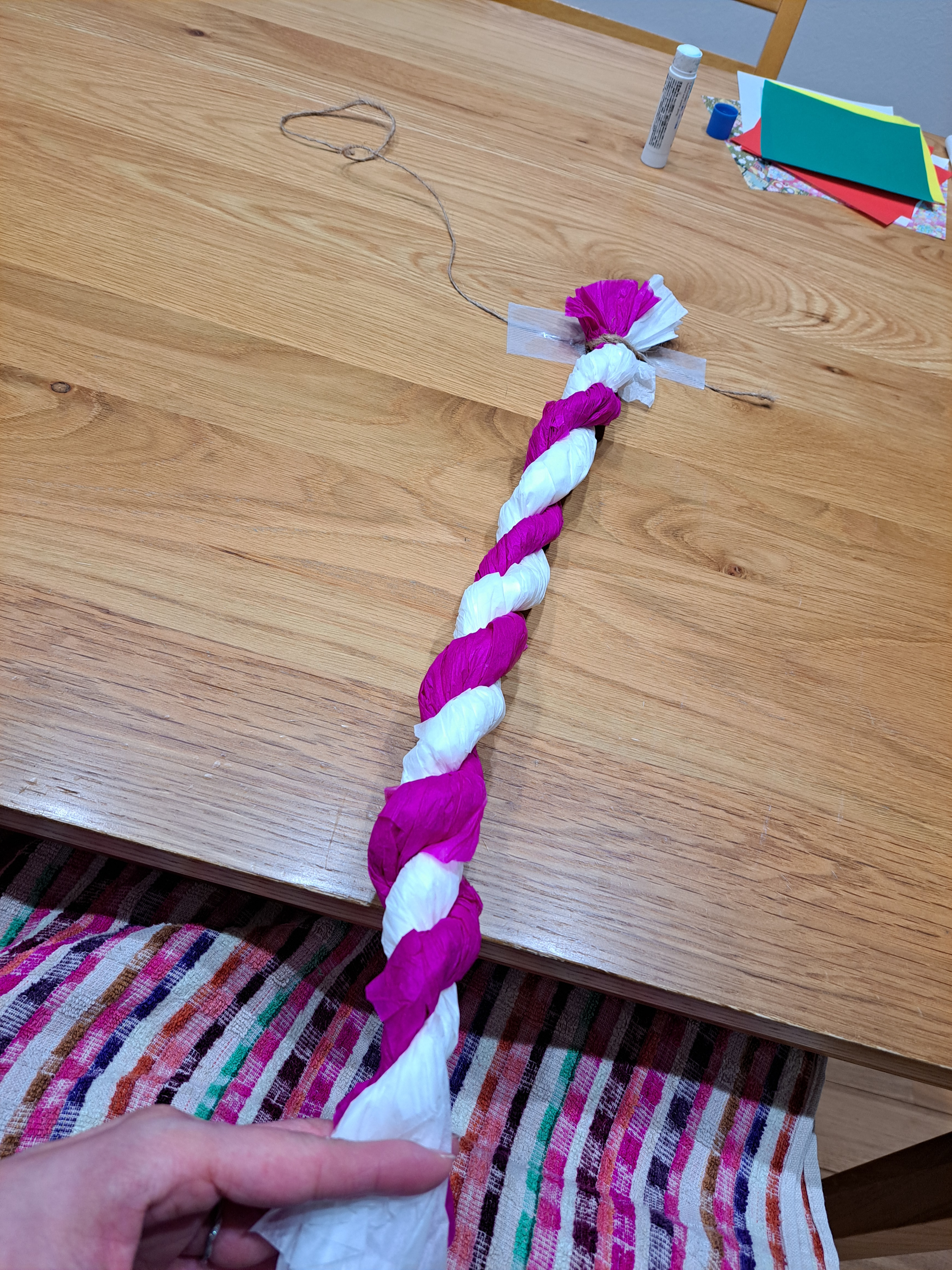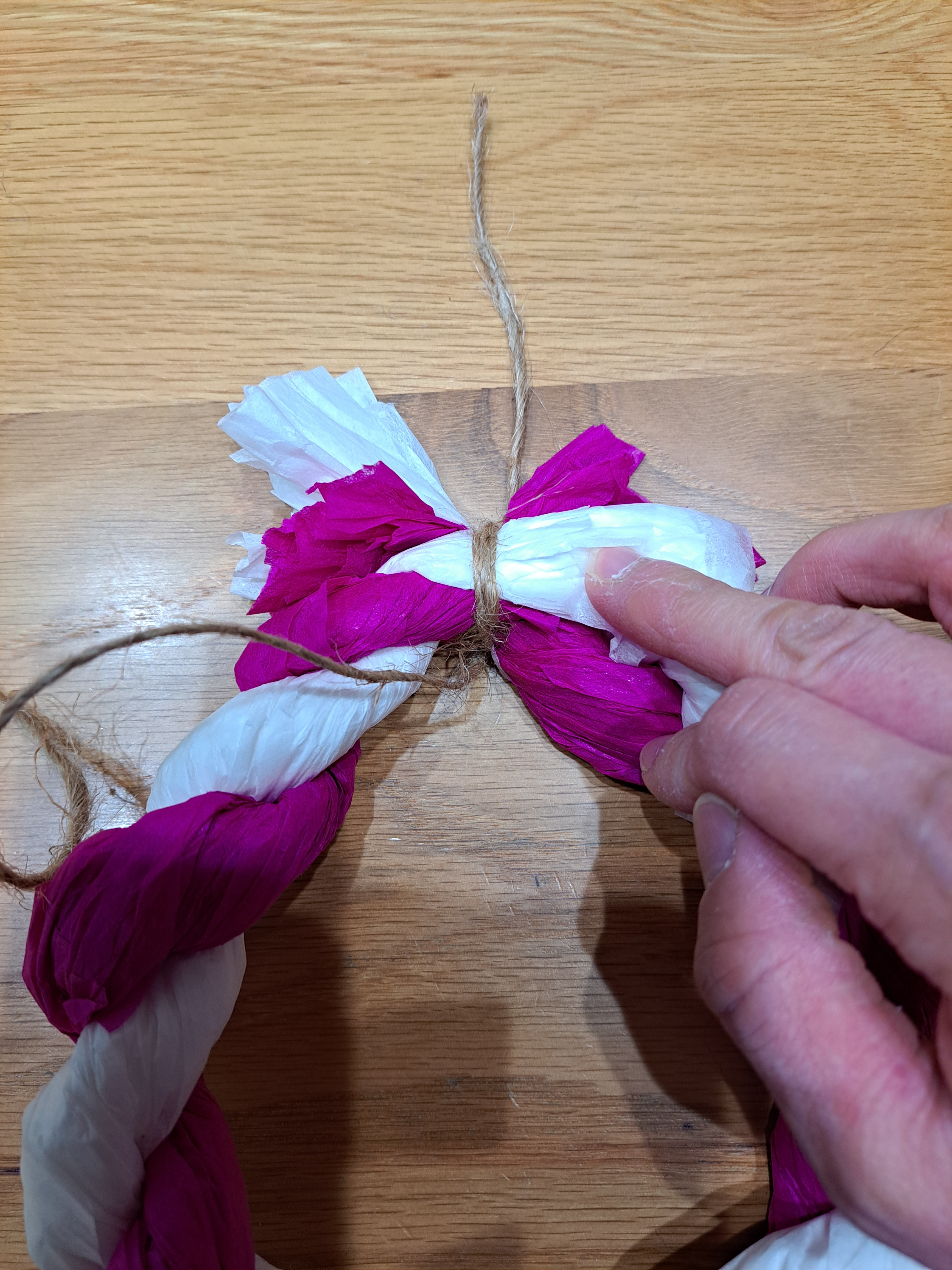 (2)今度は反時計回りに、2色のお花紙をねじっていきます。