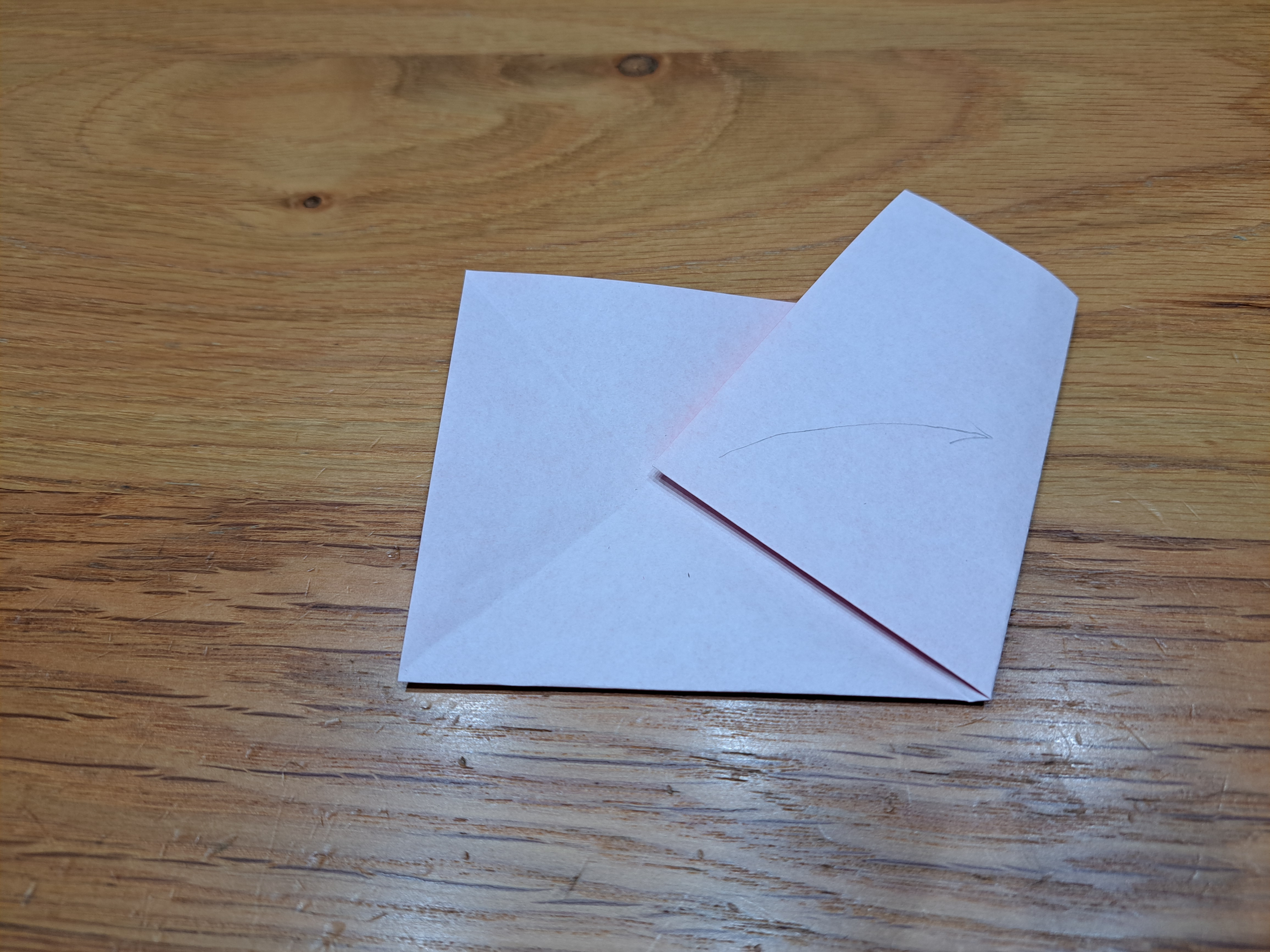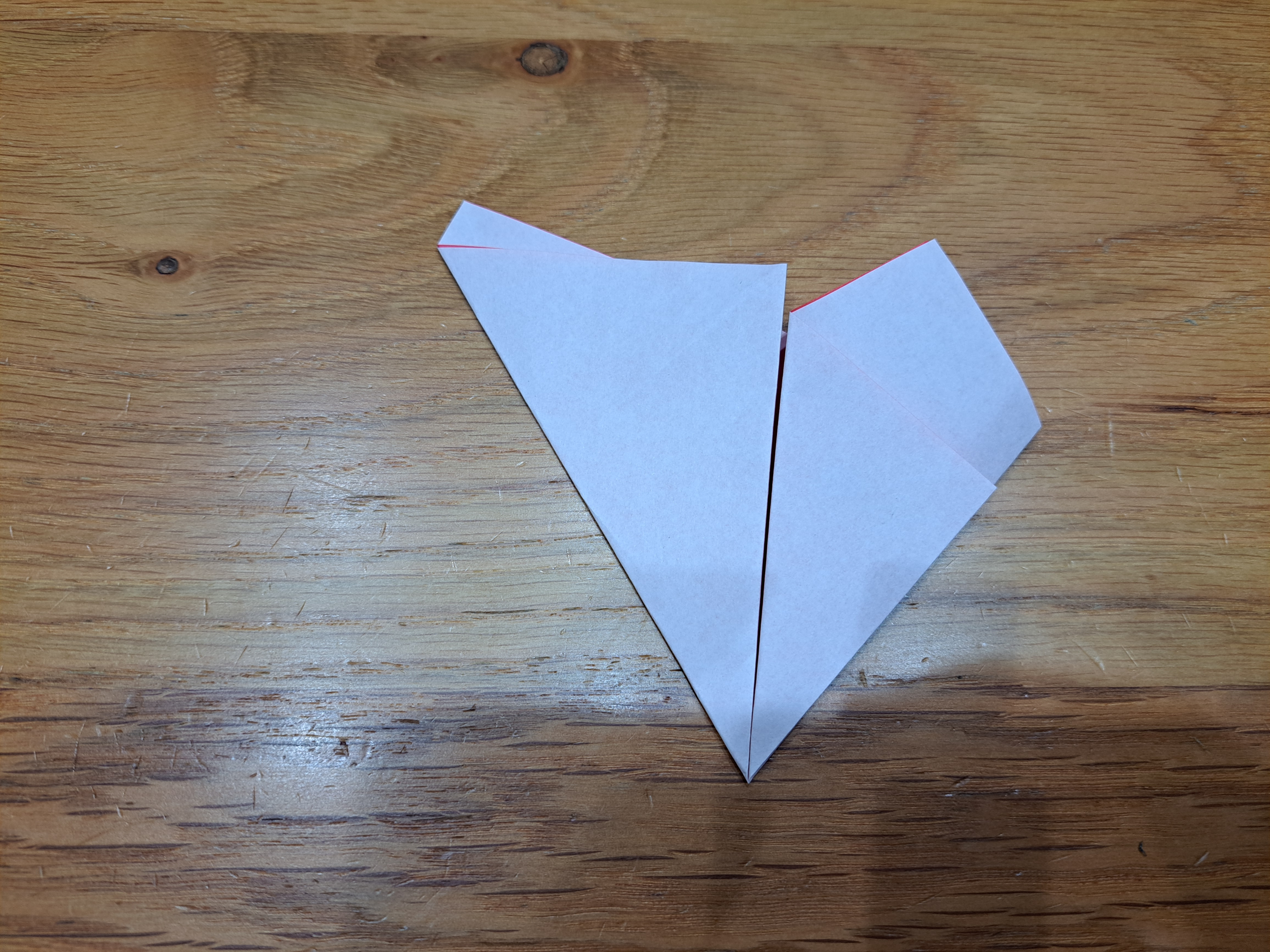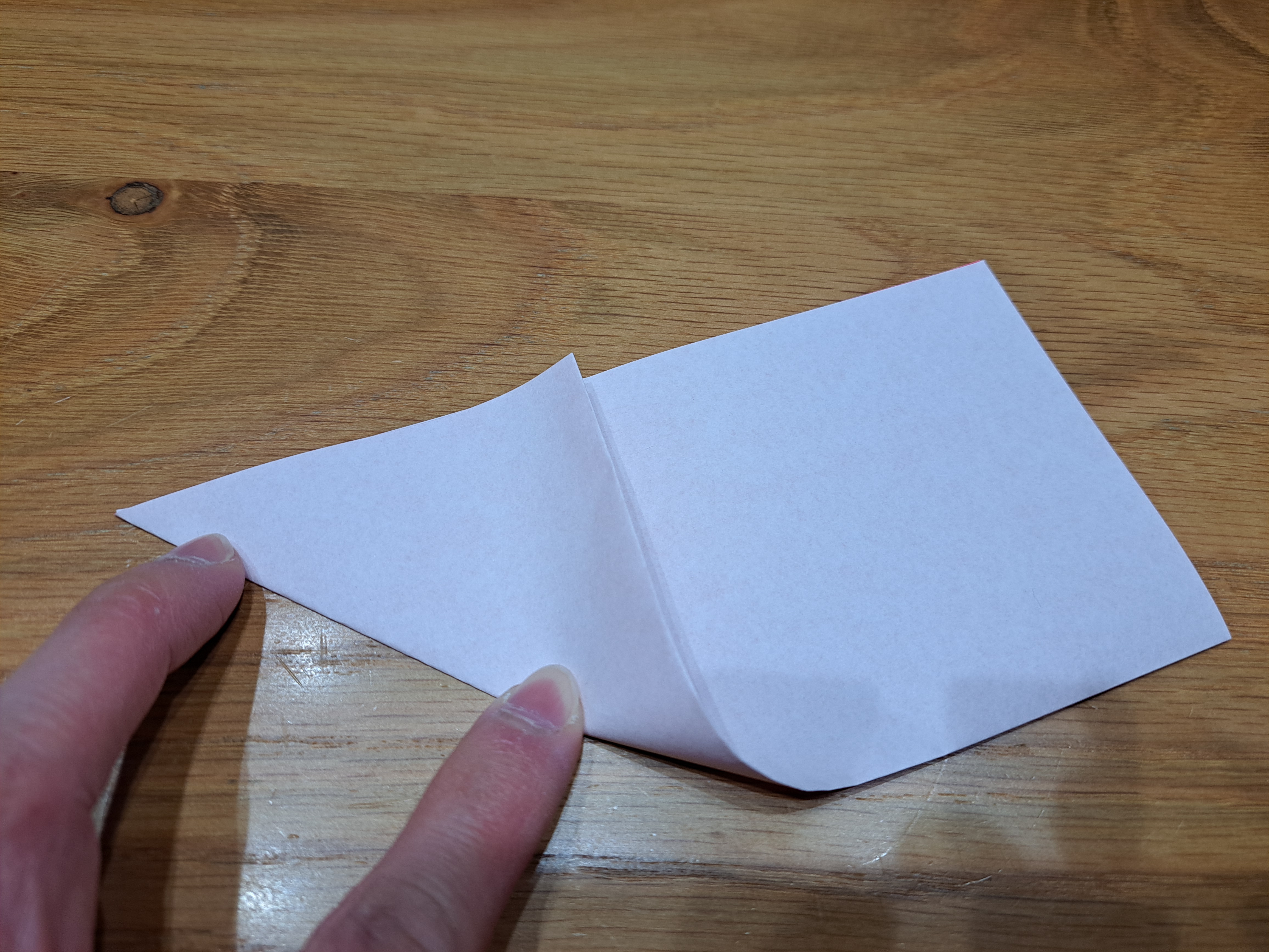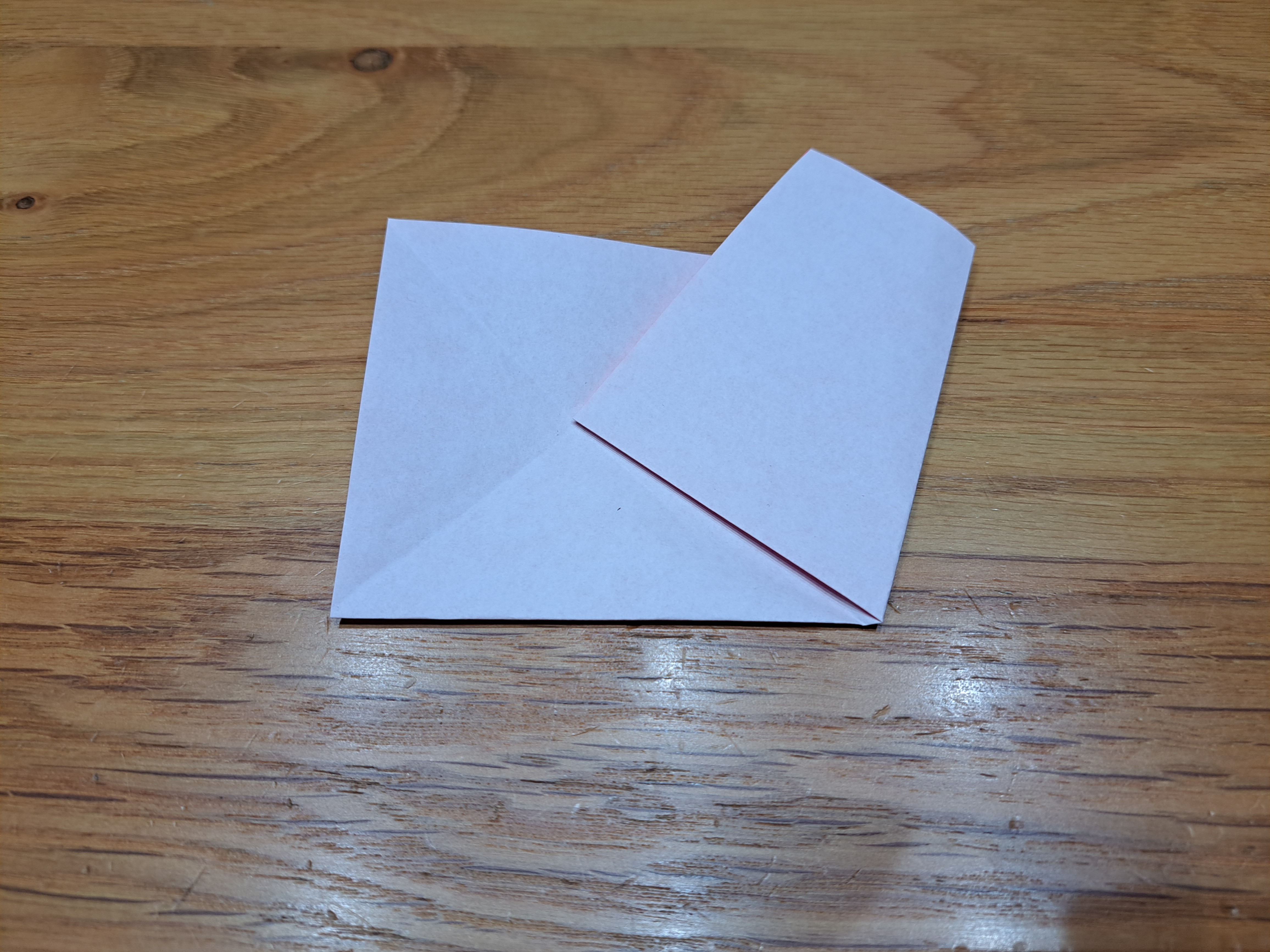④図のように持っていきます。その後、線に合わせて折ります。最後に、中心線で山折りすれば完成です。