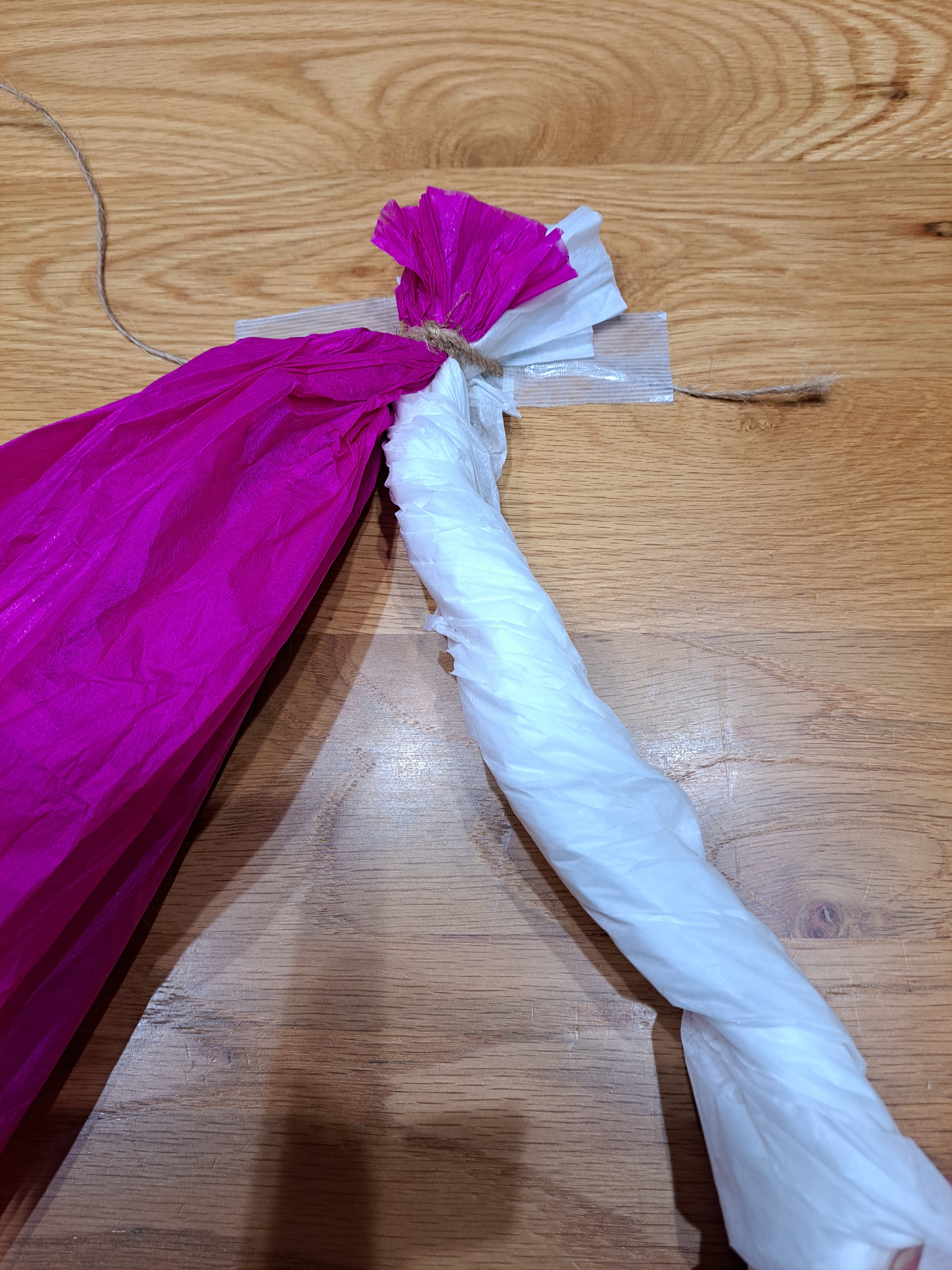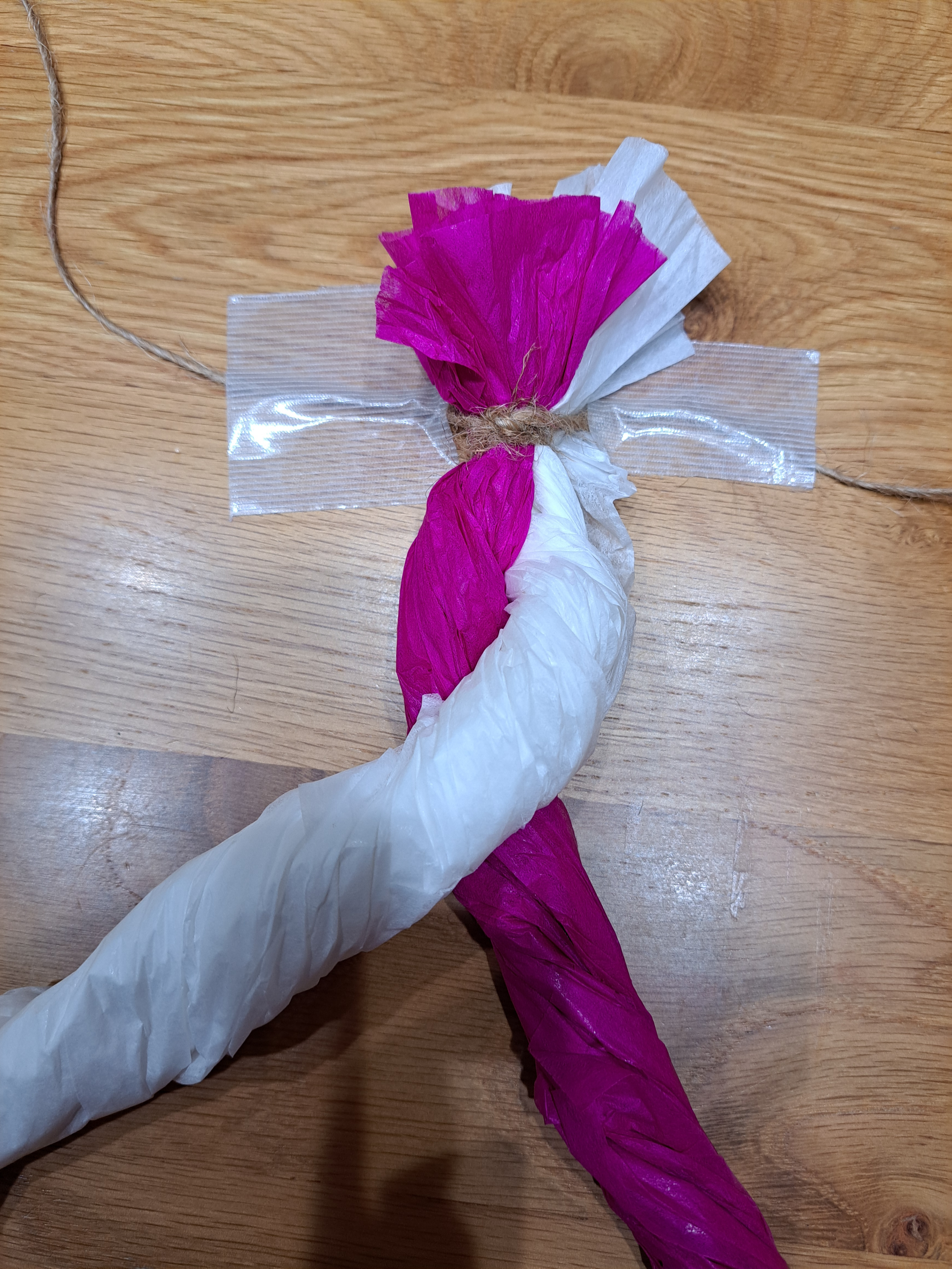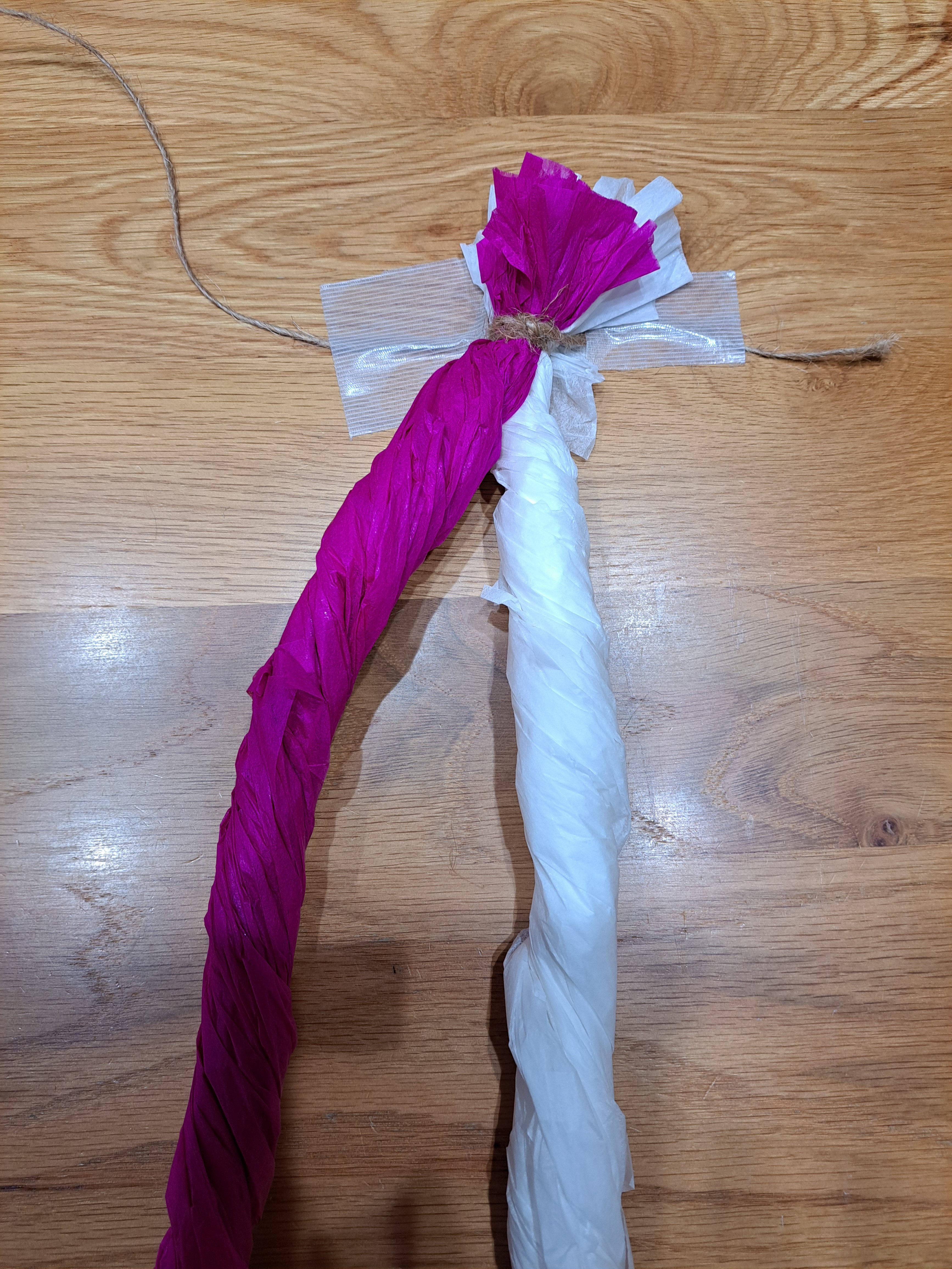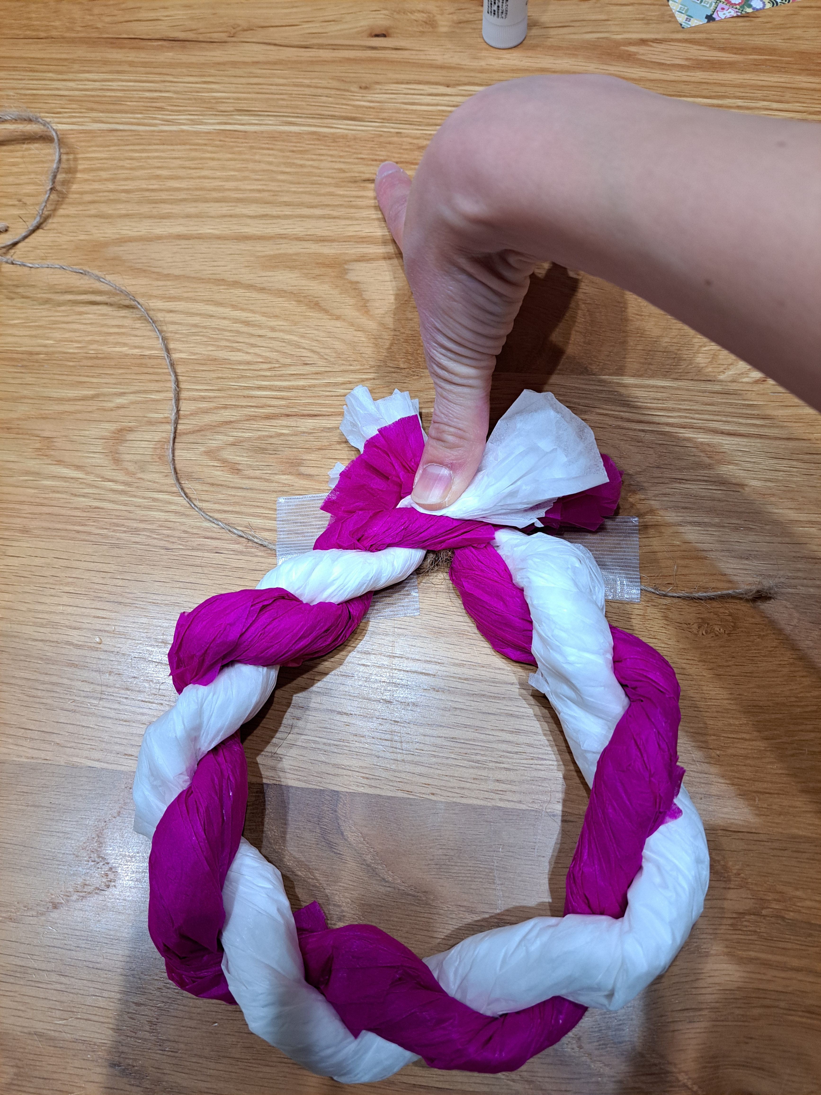 (3)先の方までできたら、図のように持っていき、長い方の麻ひもを巻いてひとまとめにし、結びます。