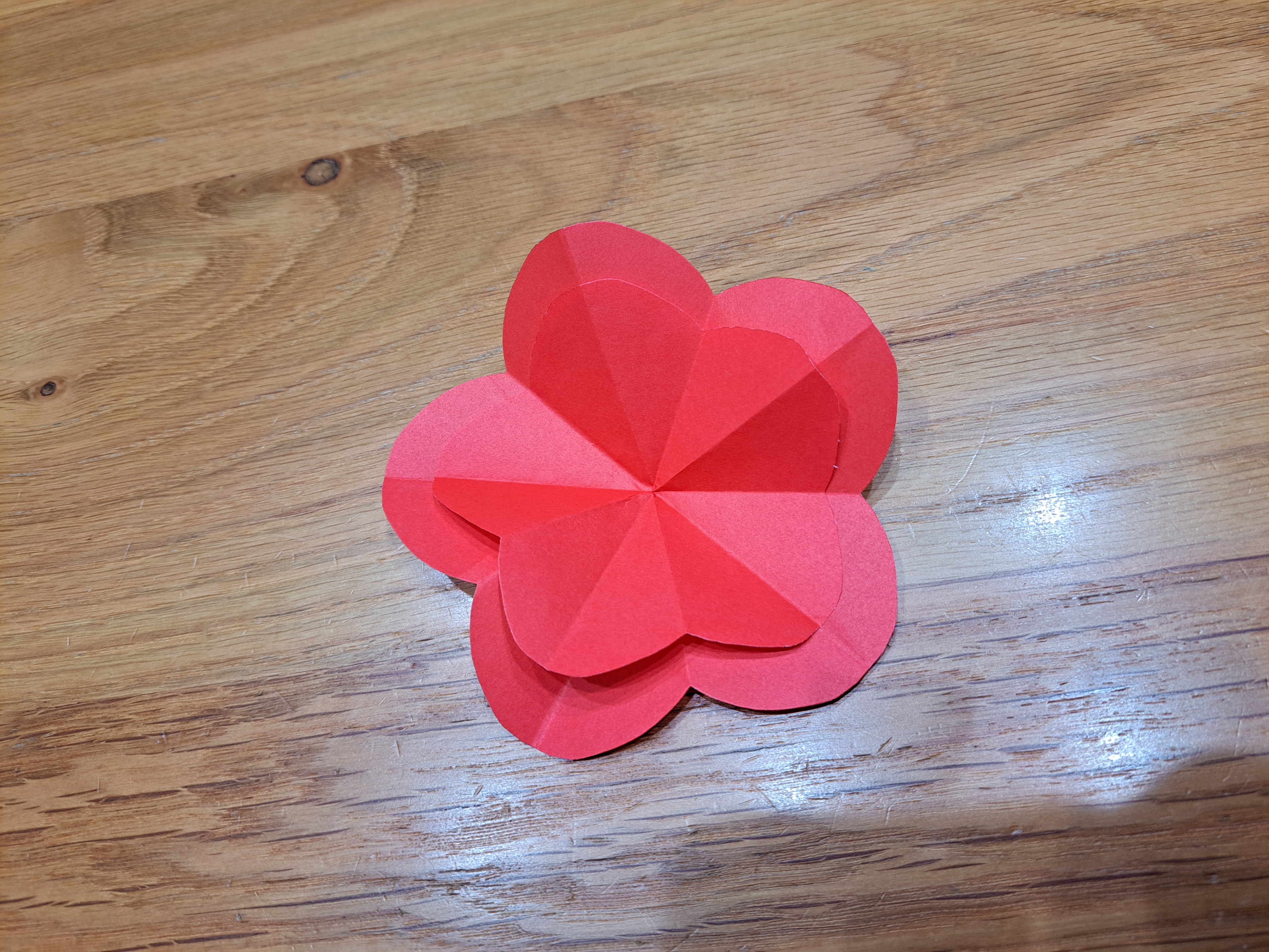 広げると図のようになります。折り目に合わせてのりで貼れば、花びらの完成です。※貼る際は中心部にのりをつける程度で大丈夫です。