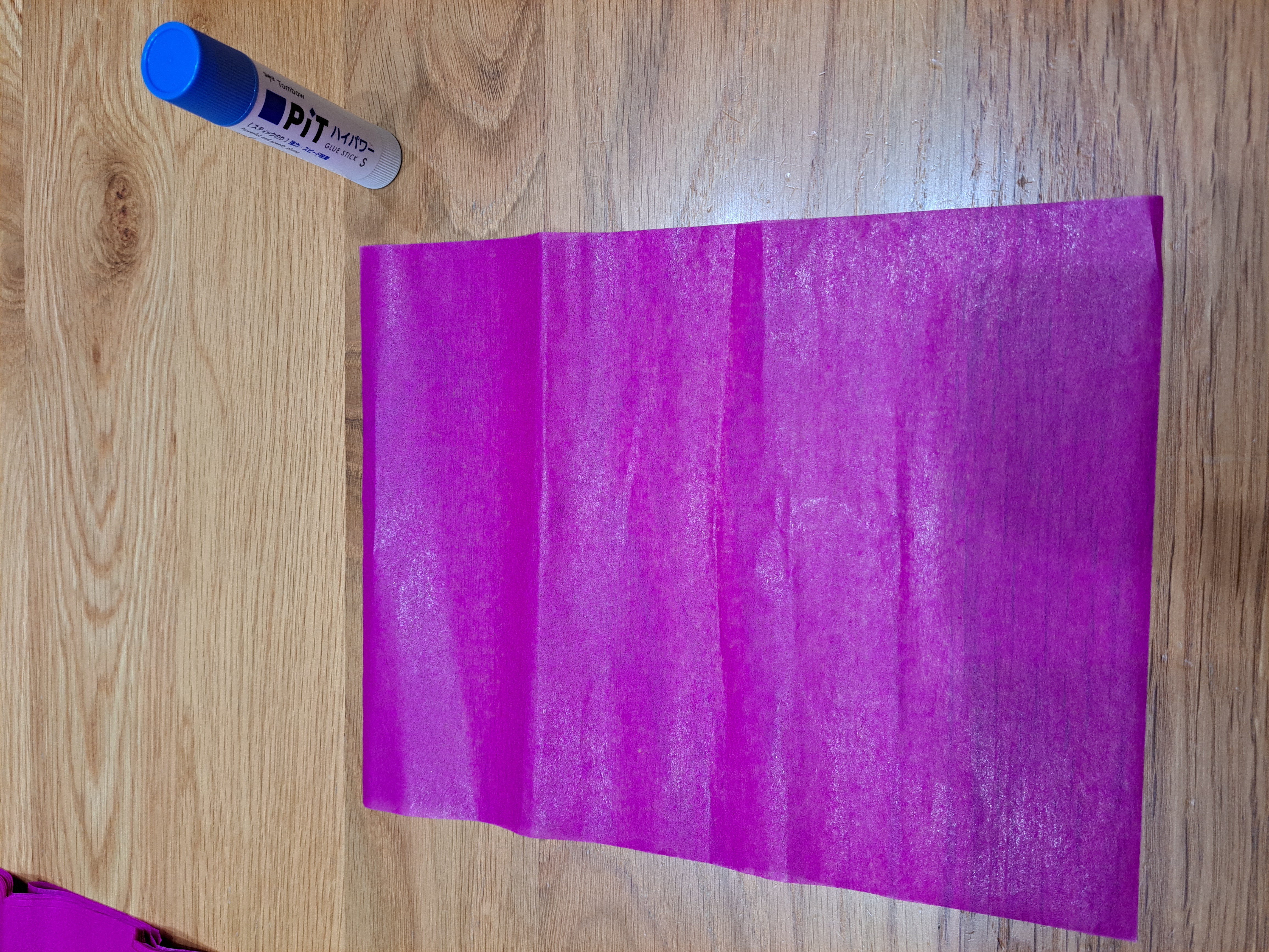 ①お花紙の長辺の方にのりを付け、別のお花紙を貼り付けます。