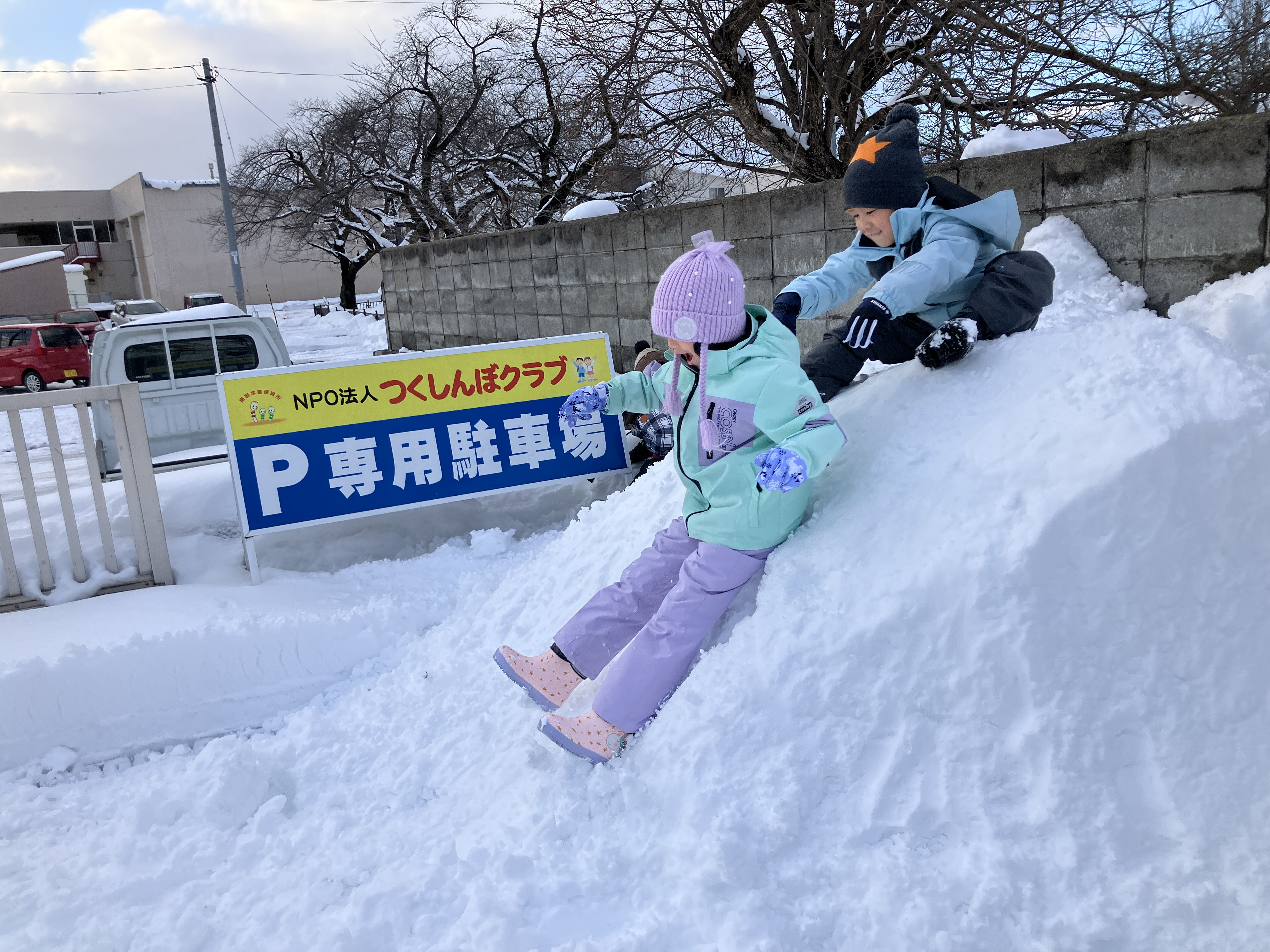 玄関前に積もった雪山ですべり台!たのしいーーー😝‼️