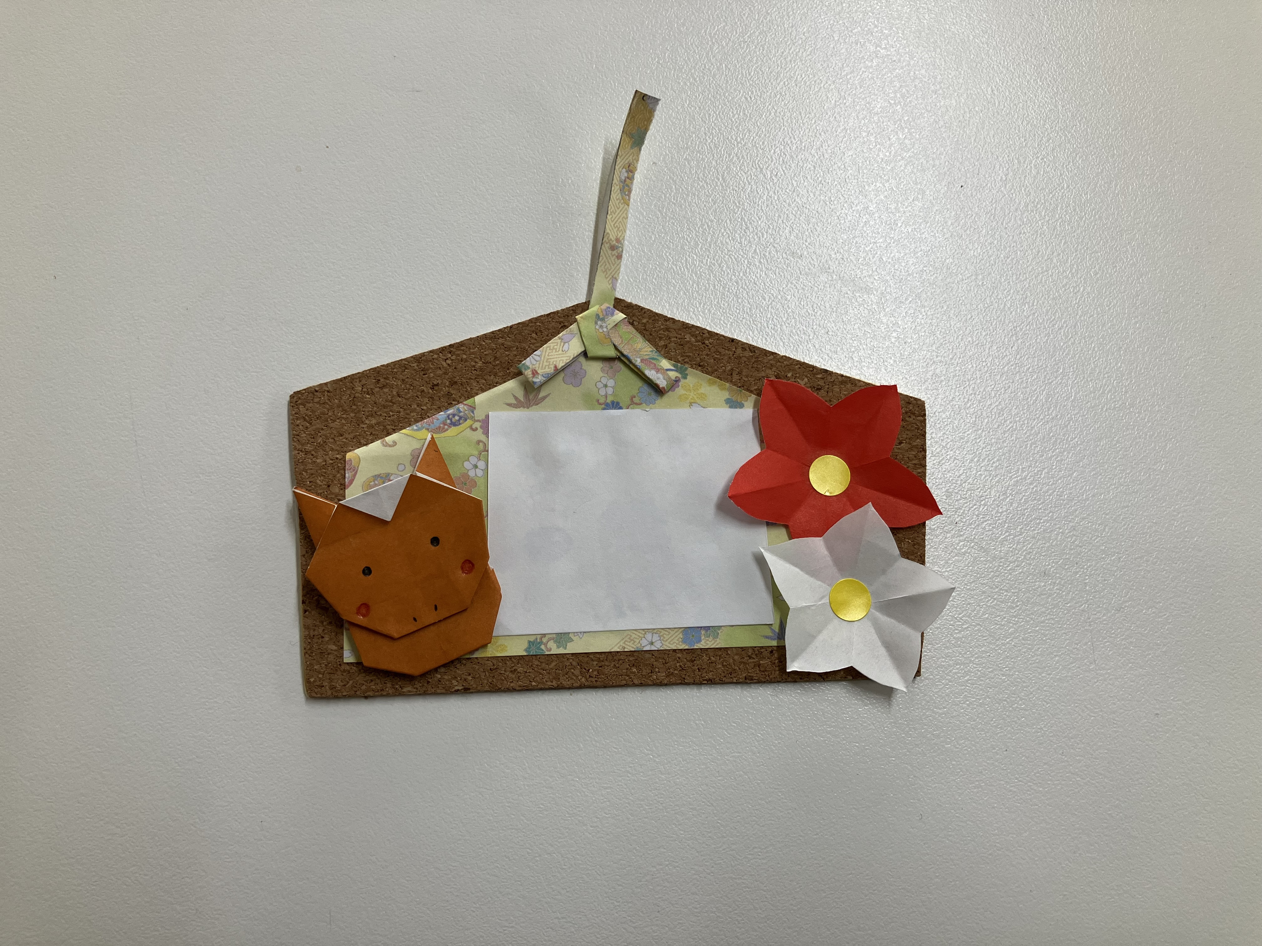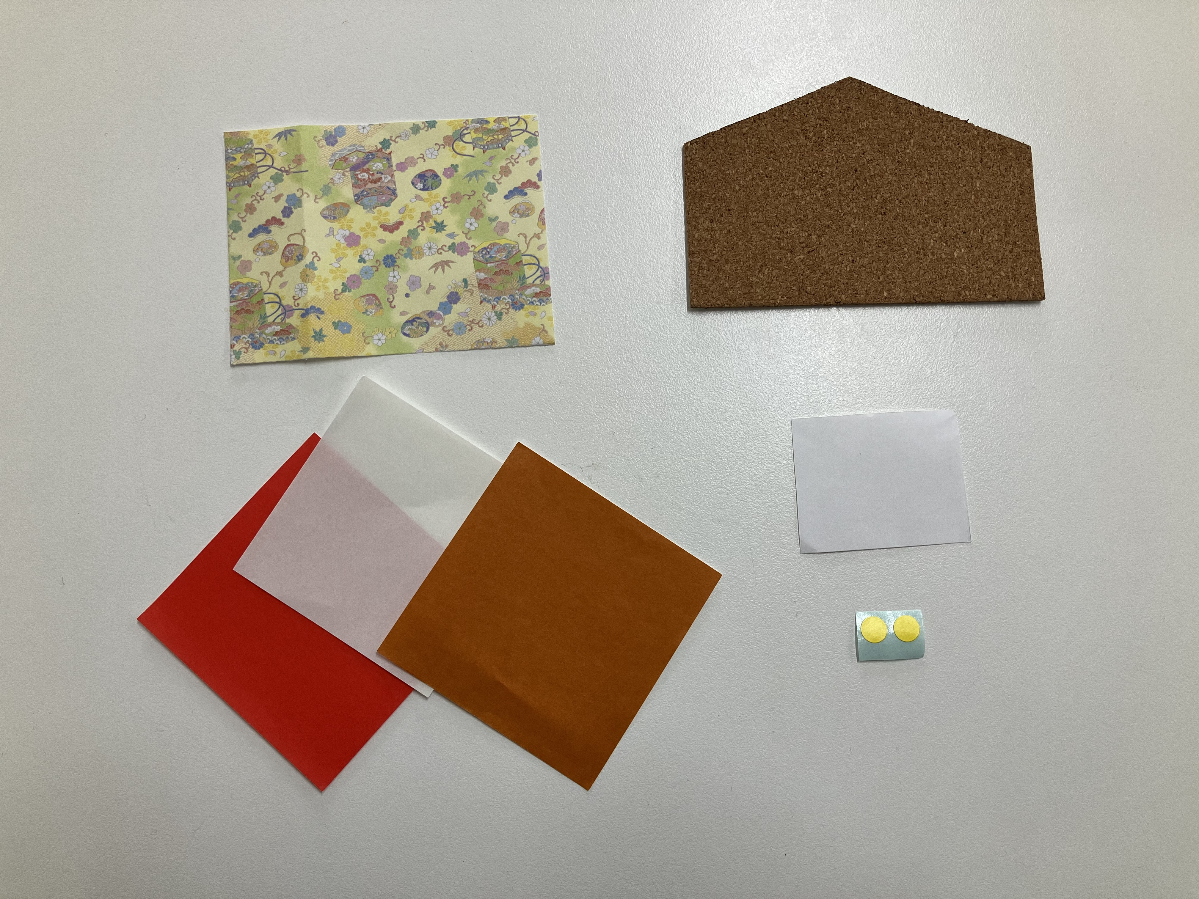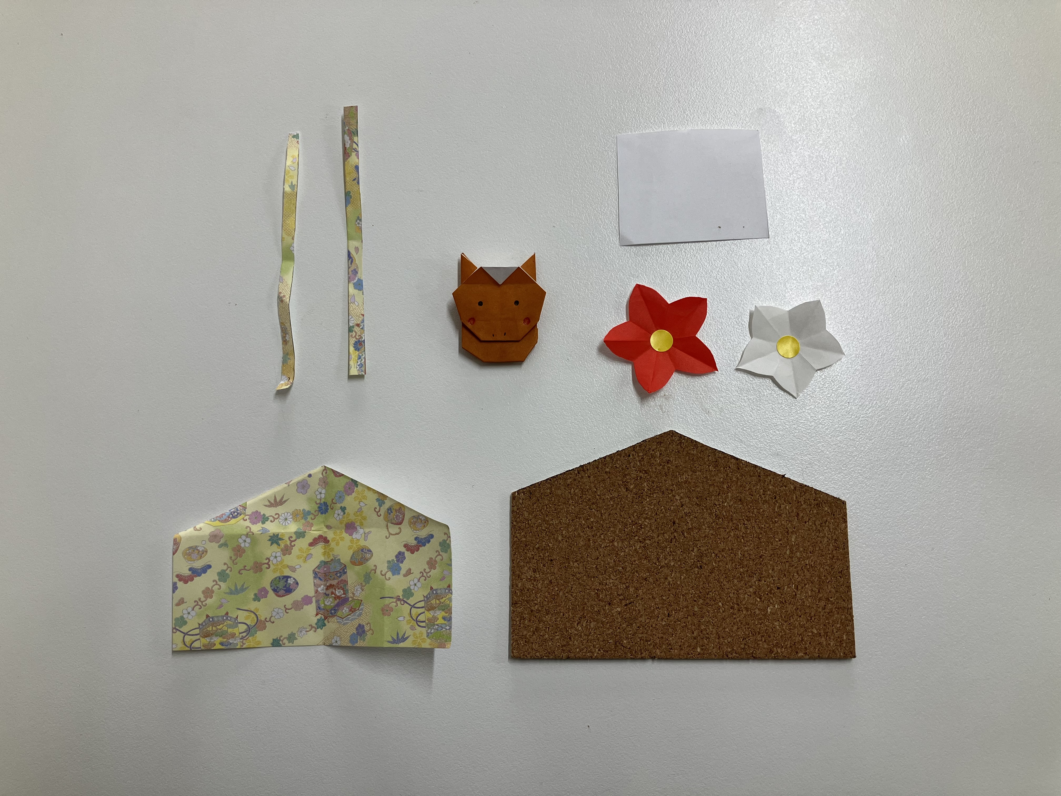 コルクシートに穴をあけ、0,5㎝幅の和折り紙を通してのり付けします。穴を隠すように結んだ和折り紙を貼れば完成です。