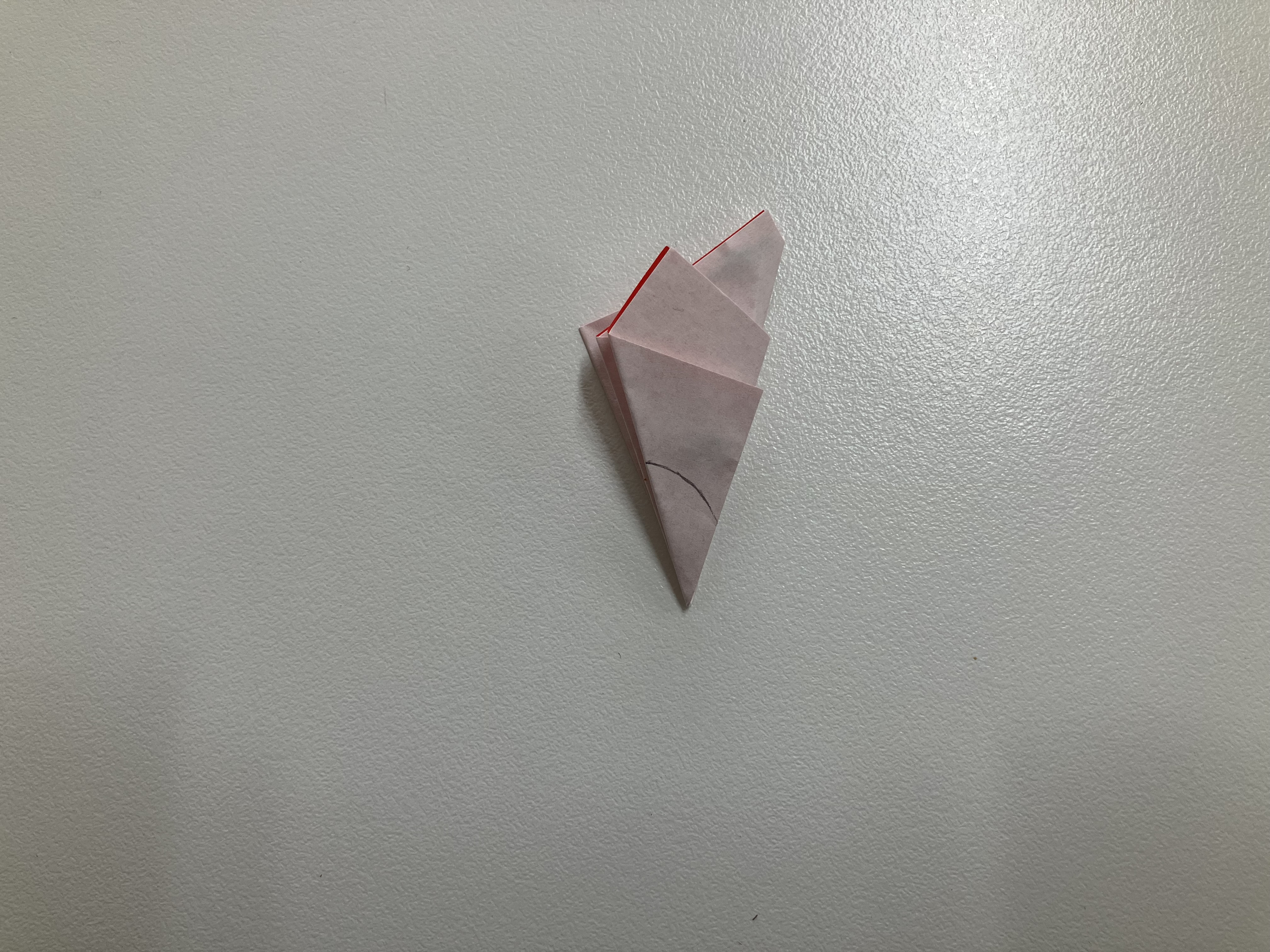③図のように折り、一度元の状態まで開きます。開いたら赤い線の部分で切ります。開くと絵馬の形になります。
