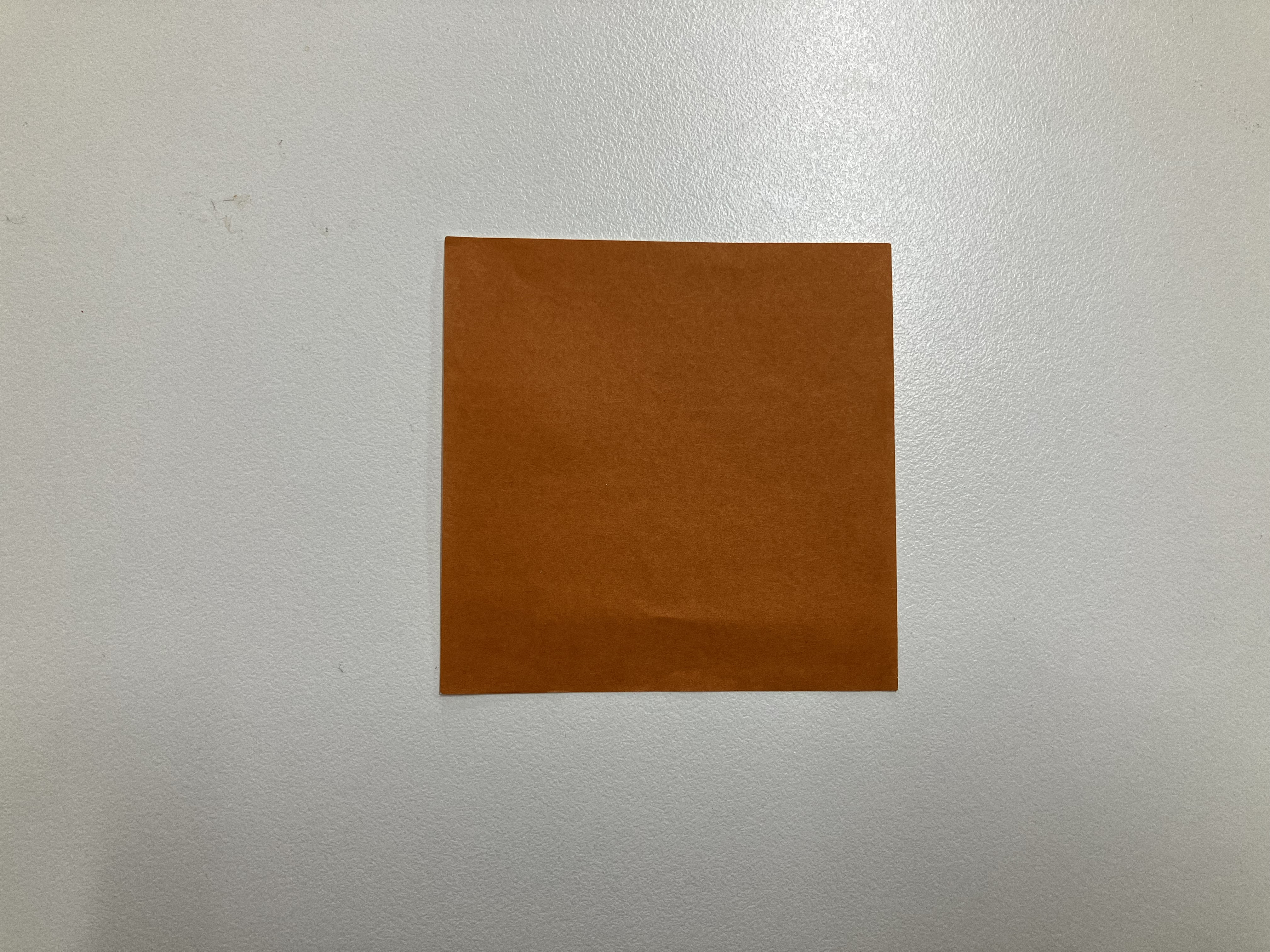 ①茶色の折り紙を、半分に折り、開いてまた半分に折って折り目をつけます